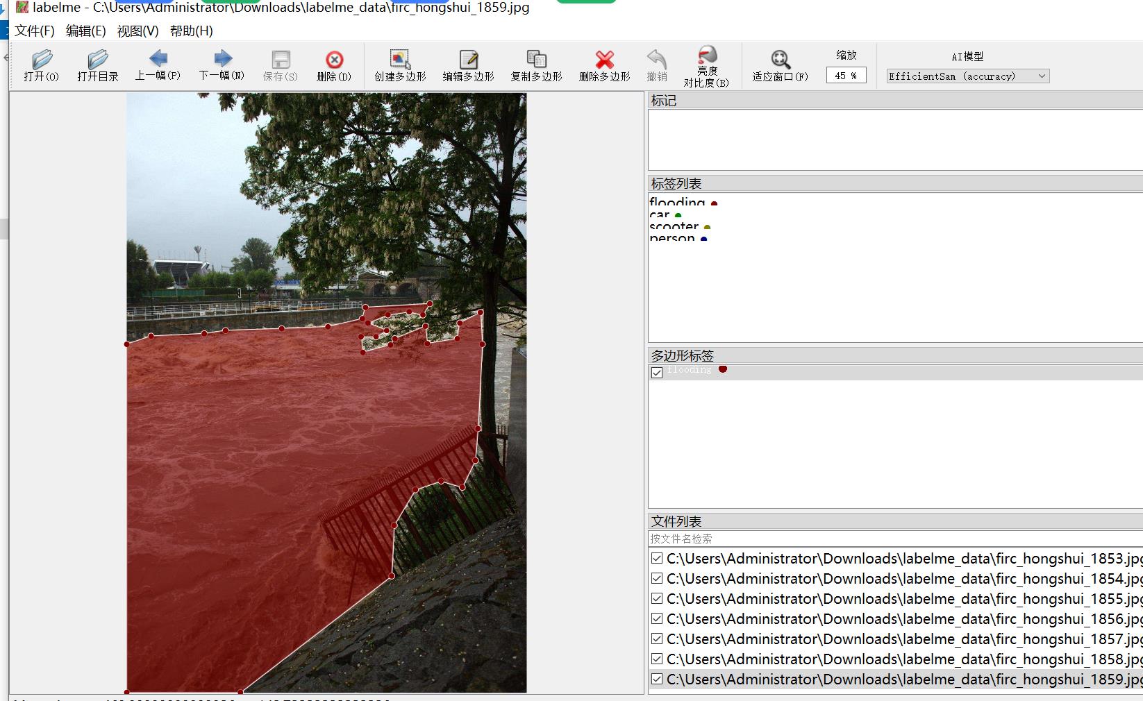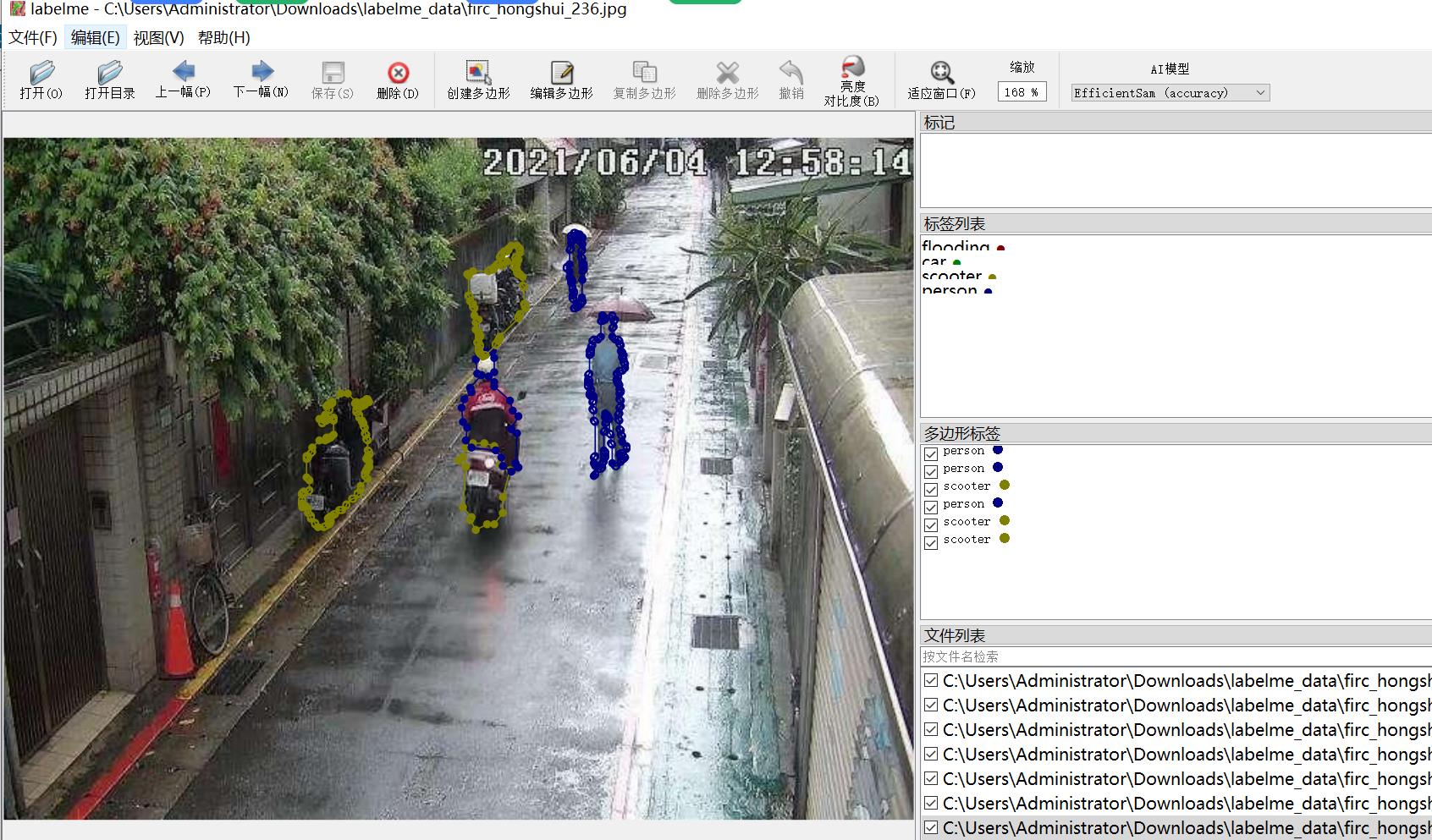 标注类别名称:["flooding","scooter","car","person"]
