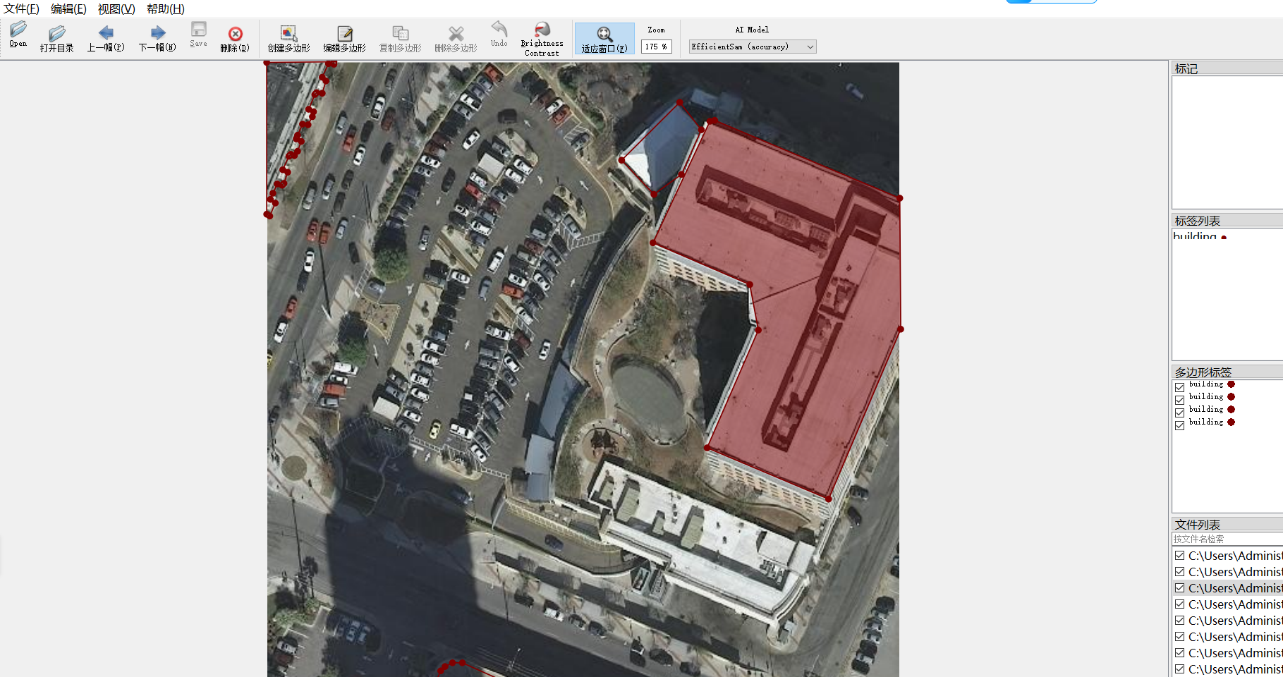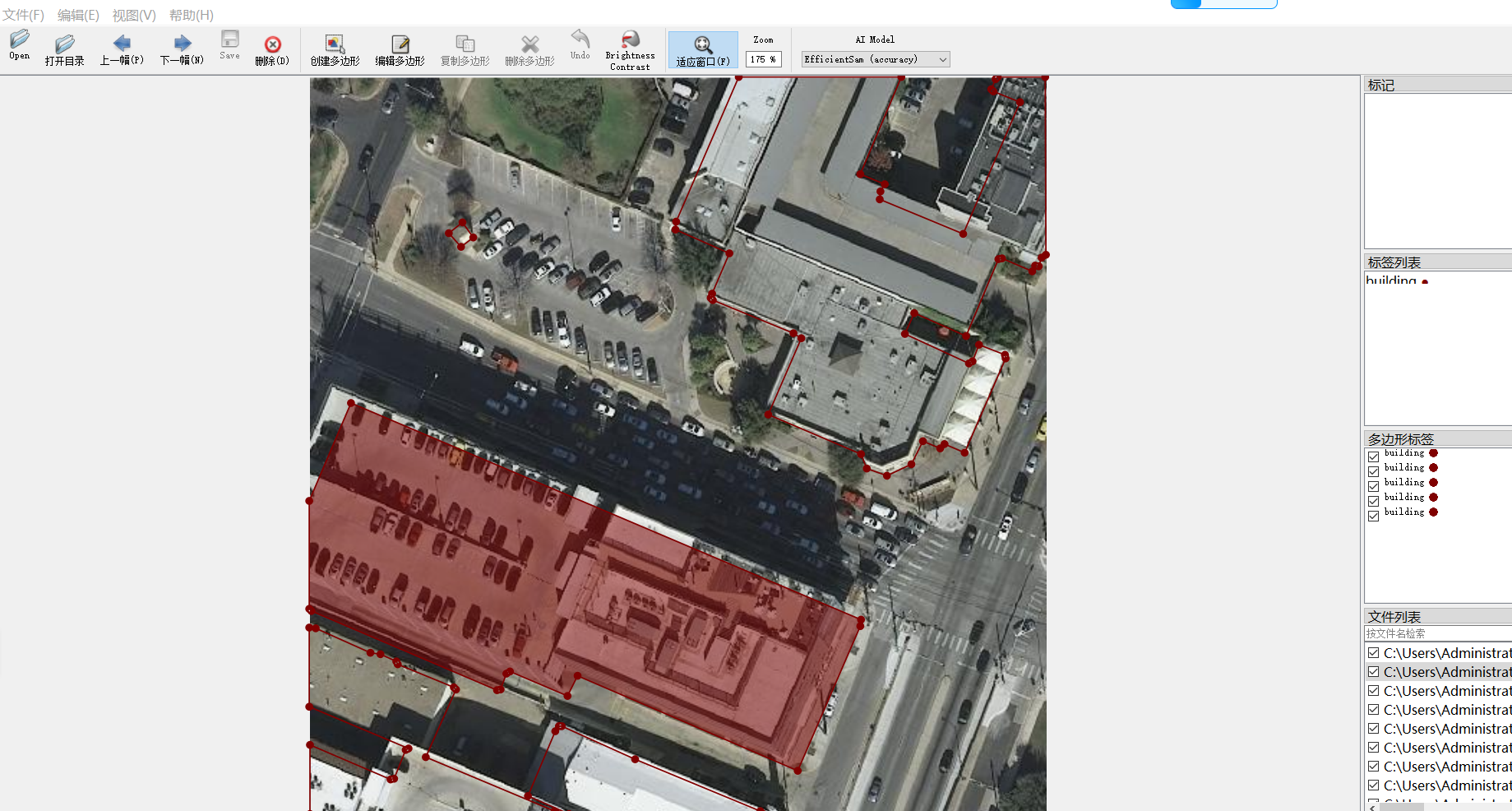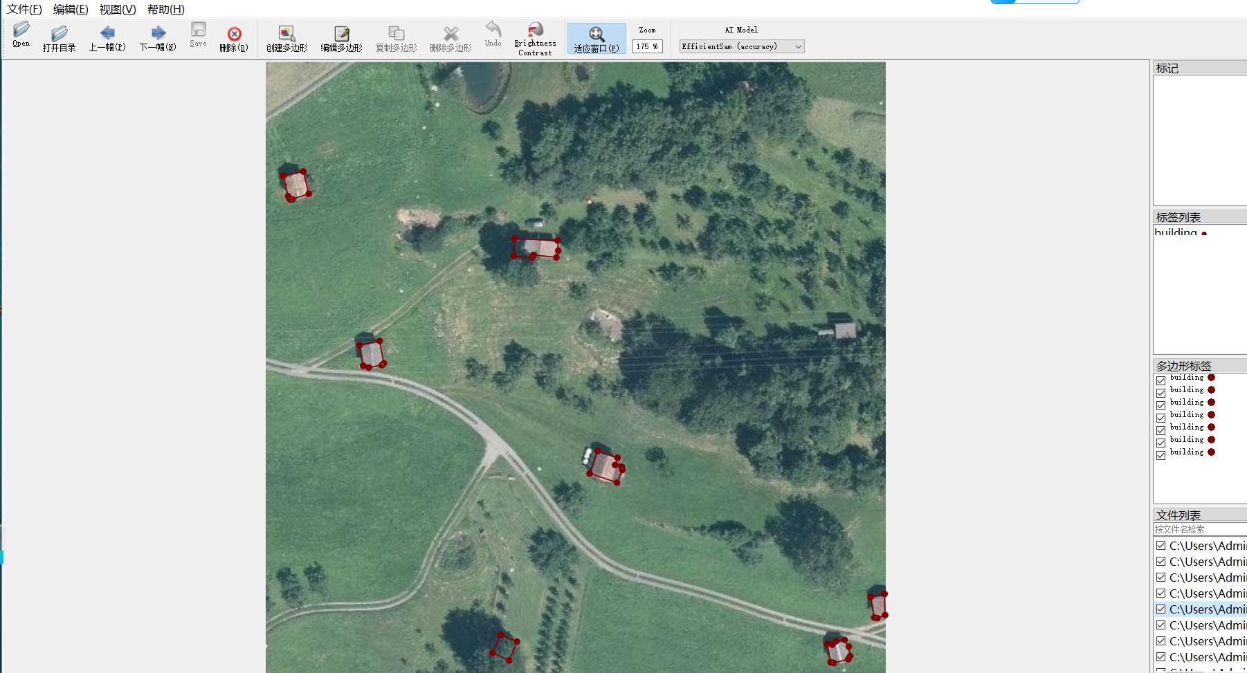 核心标注信息以标准JSON格式存储,结构清晰、易于解析。每个JSON文件对应一张图像,详细记录了图像中所有建筑物的实例信息,包括唯一的对象ID、类别标签(如“building”)、以及构成多边形轮廓的像素坐标点序列。此格式兼容主流深度学习框架(如TensorFlow、PyTorch)及标注工具(如LabelMe、CVAT),便于数据加载与预处理。