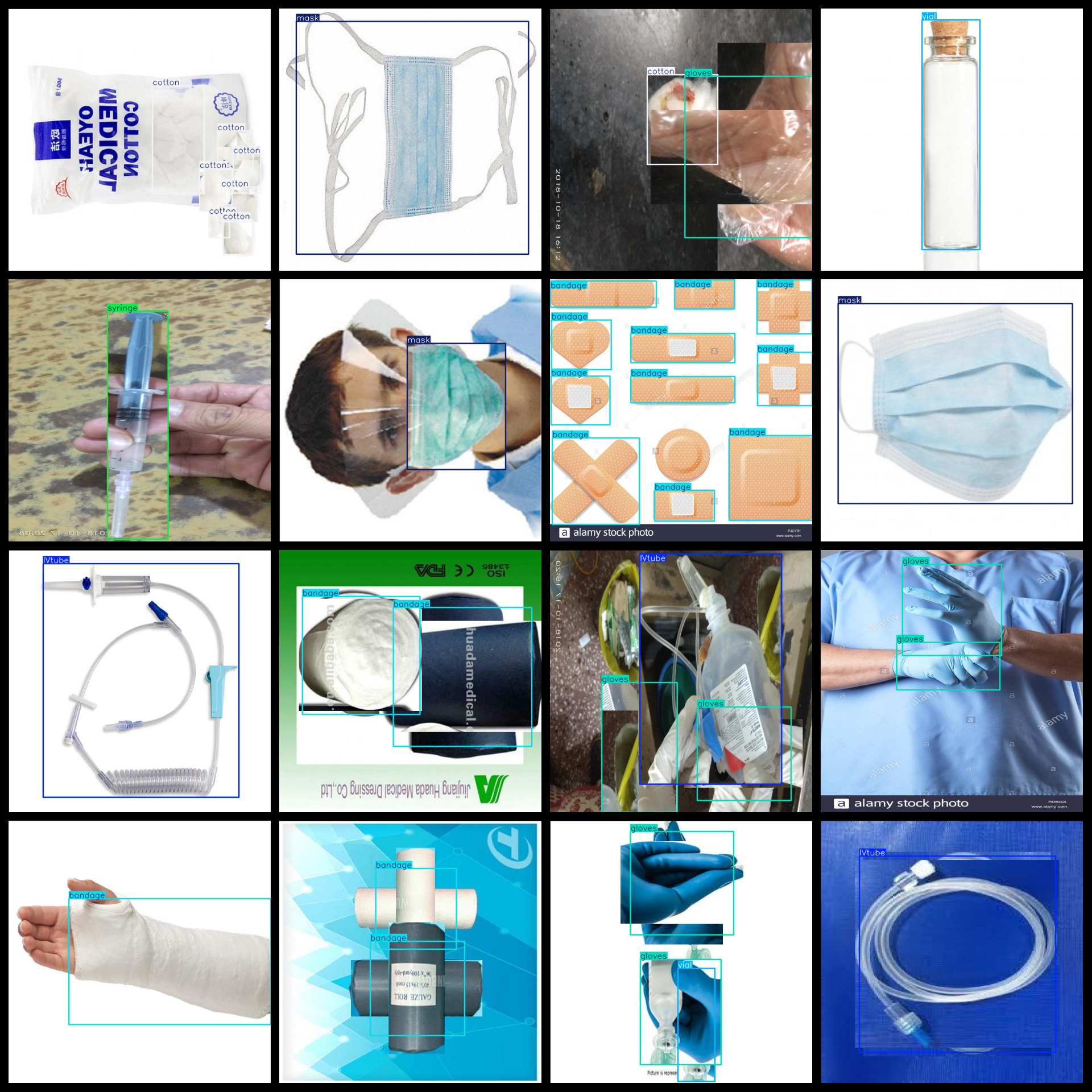 标签名称:["IVtube","bandage","cotton","gloves","mask","medical cap","needle","scissors","syringe","test tube","vial","waste"]