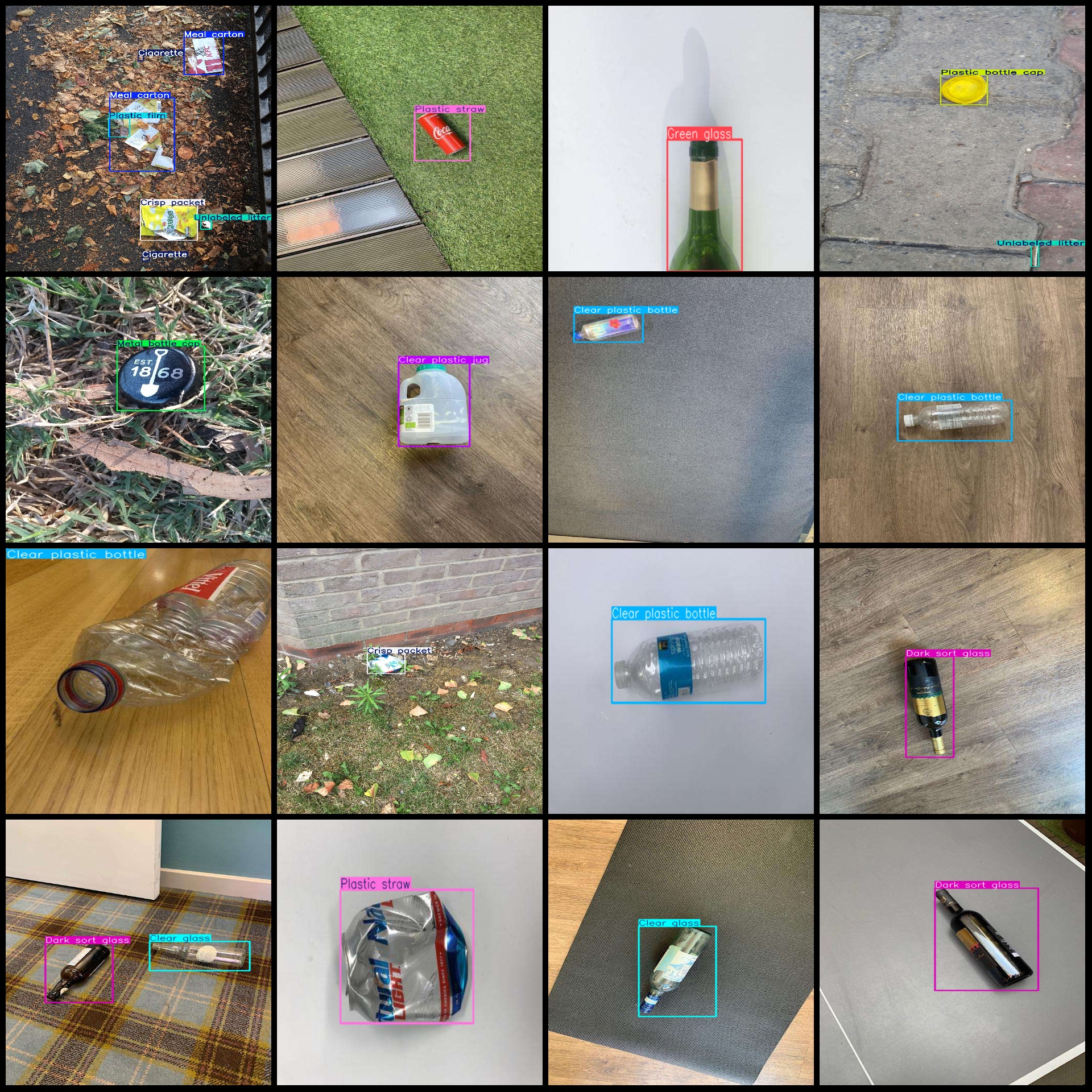标注类别名称(注意yolo格式类别顺序不和这个对应,而以labels文件夹classes.txt为准):["Aerosol","Aluminium blister pack","Battery","Broken glass","Brown glass","Carded blister pack","Cigarette","Clear glass","Clear plastic bottle","Clear plastic jug","Colored plastic jug","Corrugated carton","Crisp packet","Dark sort glass","Disposable food container","Disposable plastic cup","Drink can","Drink carton","Egg carton","Foam cup","Foam food container","Food Can","Food waste","Garbage bag","Glass cup","Glass jar","Green glass","Magazine paper","Meal carton","Metal bottle cap","Metal lid","Normal paper","Other carton","Other plastic","Other plastic bottle","Other plastic container","Other plastic cup","Other plastic wrapper","Paper bag","Paper cup","Paper straw","Pizza box","Plastic bottle cap","Plastic film","Plastic glooves","Plastic lid","Plastic straw","Plastic utensils","Polypropylene bag","Pop tab","Rope - strings","Scrap metal","Shoe","Single-use carrier bag","Six pack rings","Spread tub","Squeezable tube","Styrofoam piece","Tissues","Toilet tube","Tupperware","Unlabeled litter","Wrapping paper","json"]