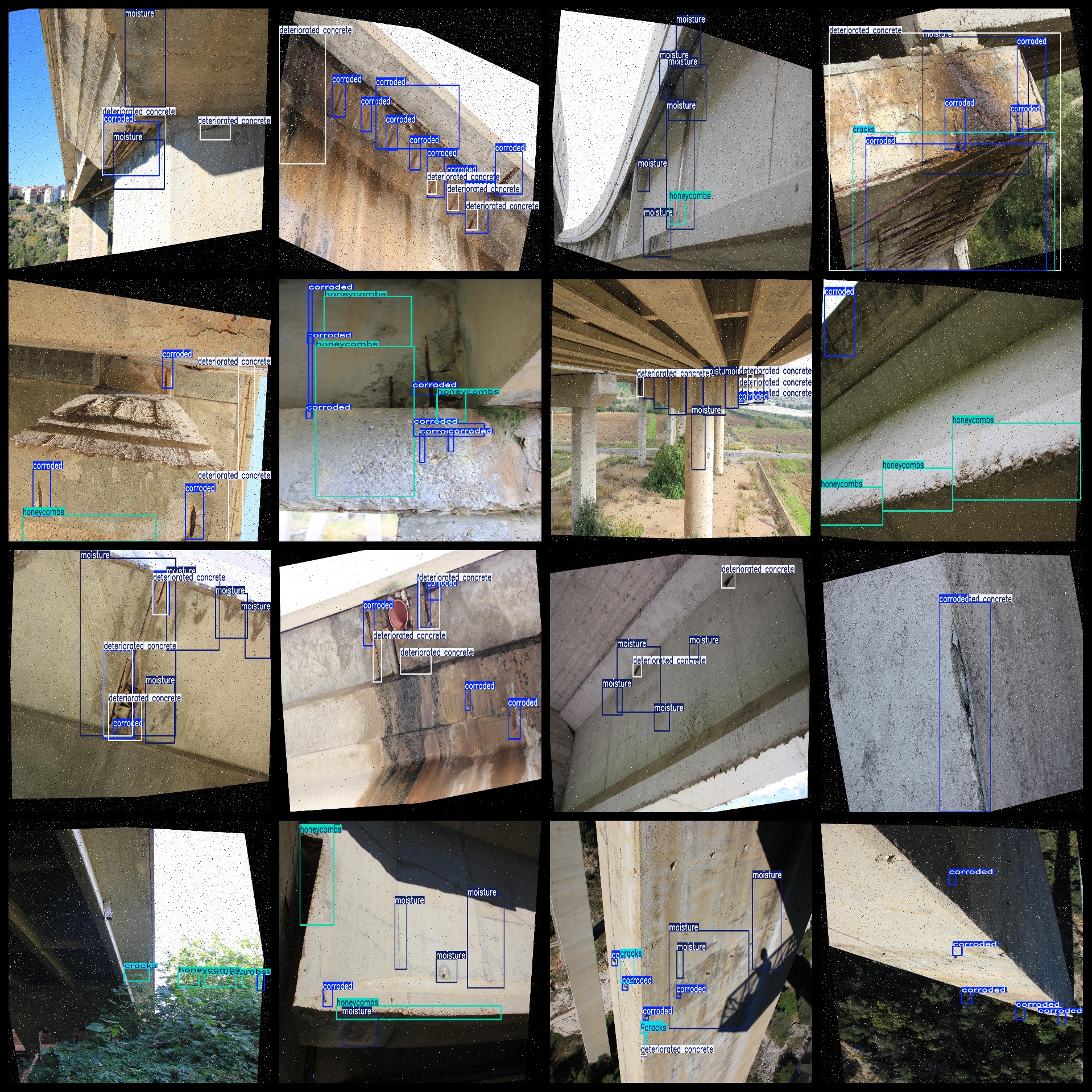 标签中文对照:[“腐蚀”、“裂缝”、“劣化混凝土”、“蜂窝状缺陷”、“潮湿”、“路面退化”、“收缩裂缝”、“底部收缩裂缝”]