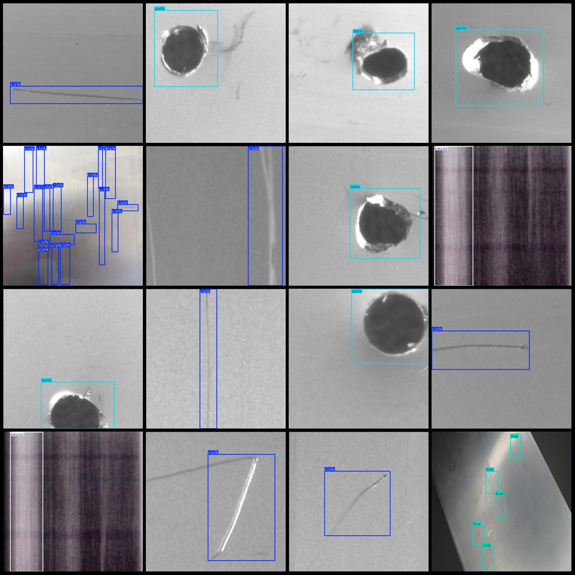 标注类别名称(注意yolo格式类别顺序不和这个对应,而以labels文件夹classes.txt为准):["beyaz","cizik","delik","line"]
