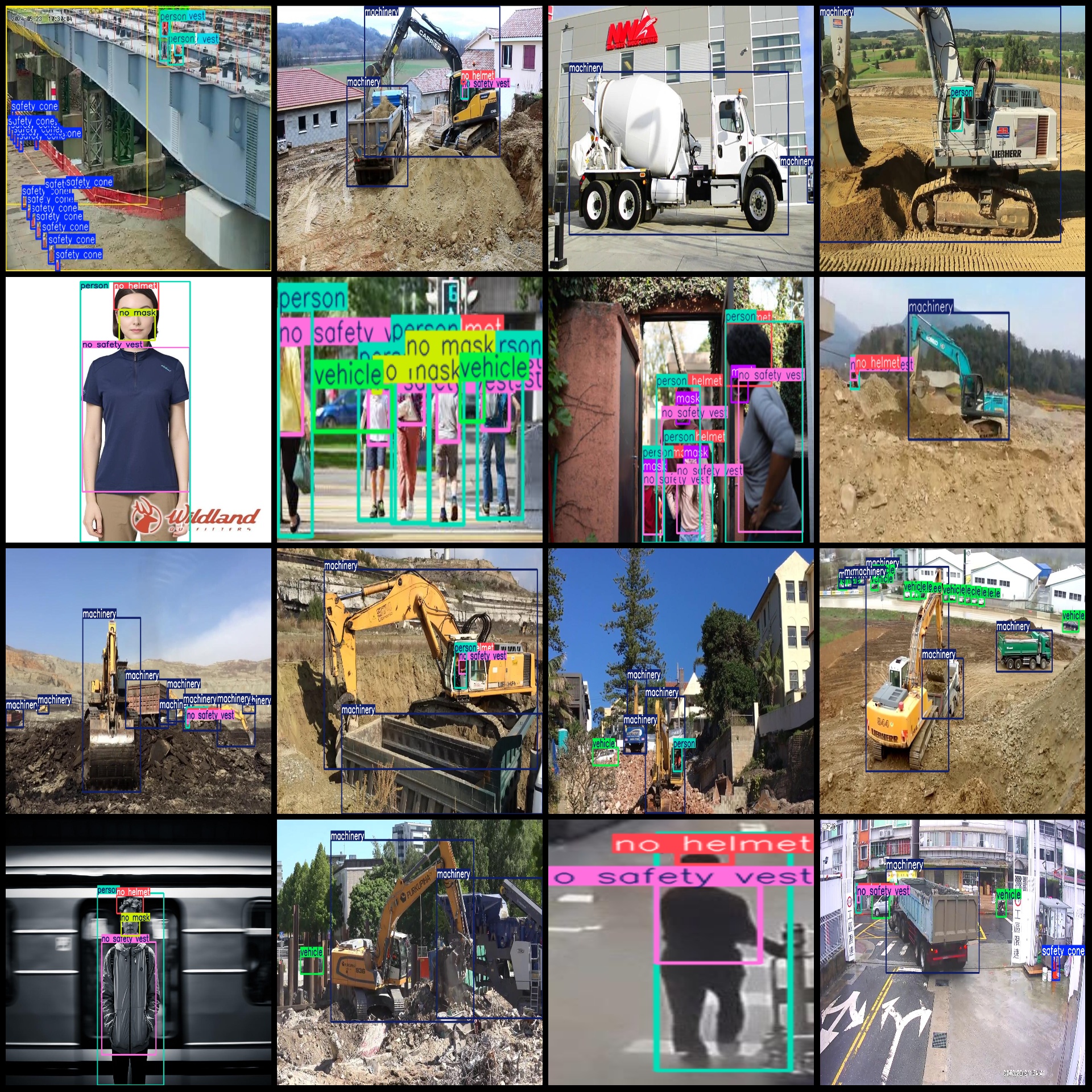 标注类别名称(注意yolo格式类别顺序不和这个对应,而以labels文件夹classes.txt为准):["helmet","machinery","mask","no helmet","no mask","no safety vest","person","safety cone","safety vest","vehicle"]
