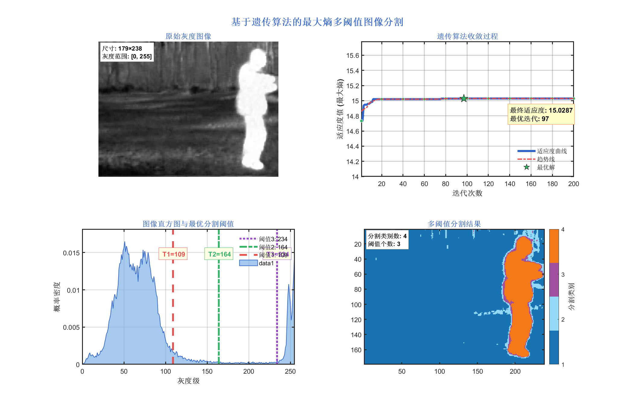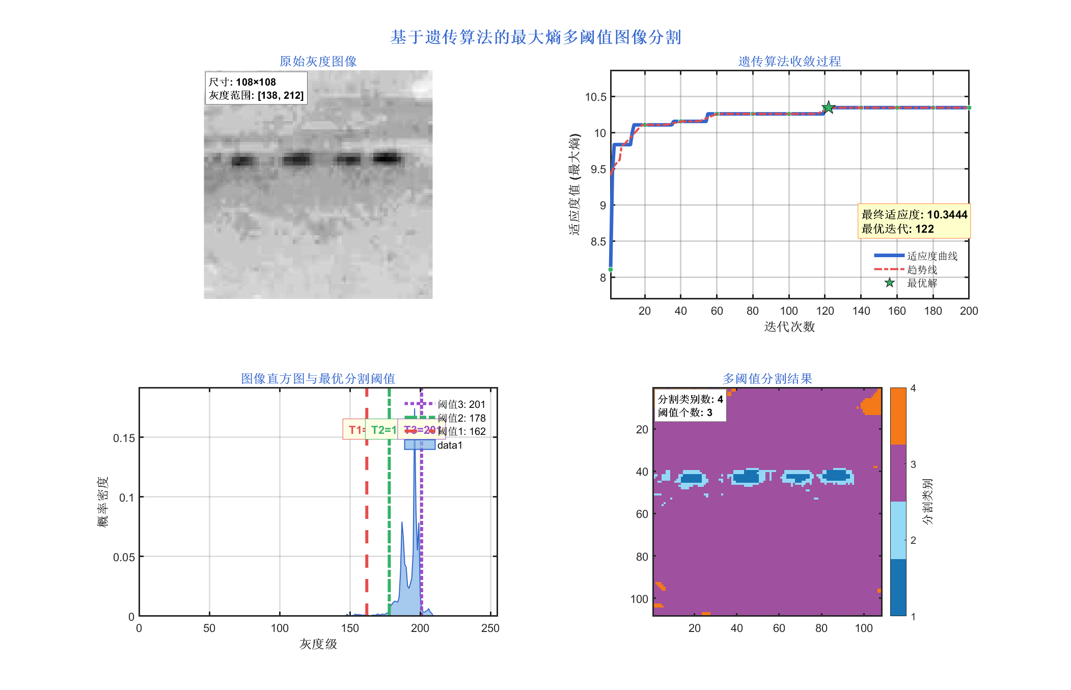 在图像分割领域,基于遗传算法的最大熵阈值分割论文已发表几十篇,知网最近可追溯到的是余荣泉和段先华在《计算机与数字工程》期刊上发表的《基于最大熵和遗传算法的图像分割方法研究》。该论文针对图像分割中传统最大熵阈值法存在的算法复杂度高、计算多阈值时运算时间长、对目标细节分割模糊以及分割结果不精确等问题,提出了将最大熵阈值分割法与遗传算法相结合的核心方法。该方法利用遗传算法的并行性、鲁棒性和自适应性,通过选择、交叉和变异操作快速搜索图像分割的最佳阈值,分别讨论了一维和二维最大熵阈值分割的情况,并以二维熵函数作为适应度函数优化阈值选择过程。该方法被广泛应用于图像处理、计算机视觉等领域,实验结果表明,与传统最大熵分割算法相比,该方法在分割效率和精度上均有显著提升,分割时间大幅缩短,细节分割效果更优,具有较高的理论价值和实践影响力。