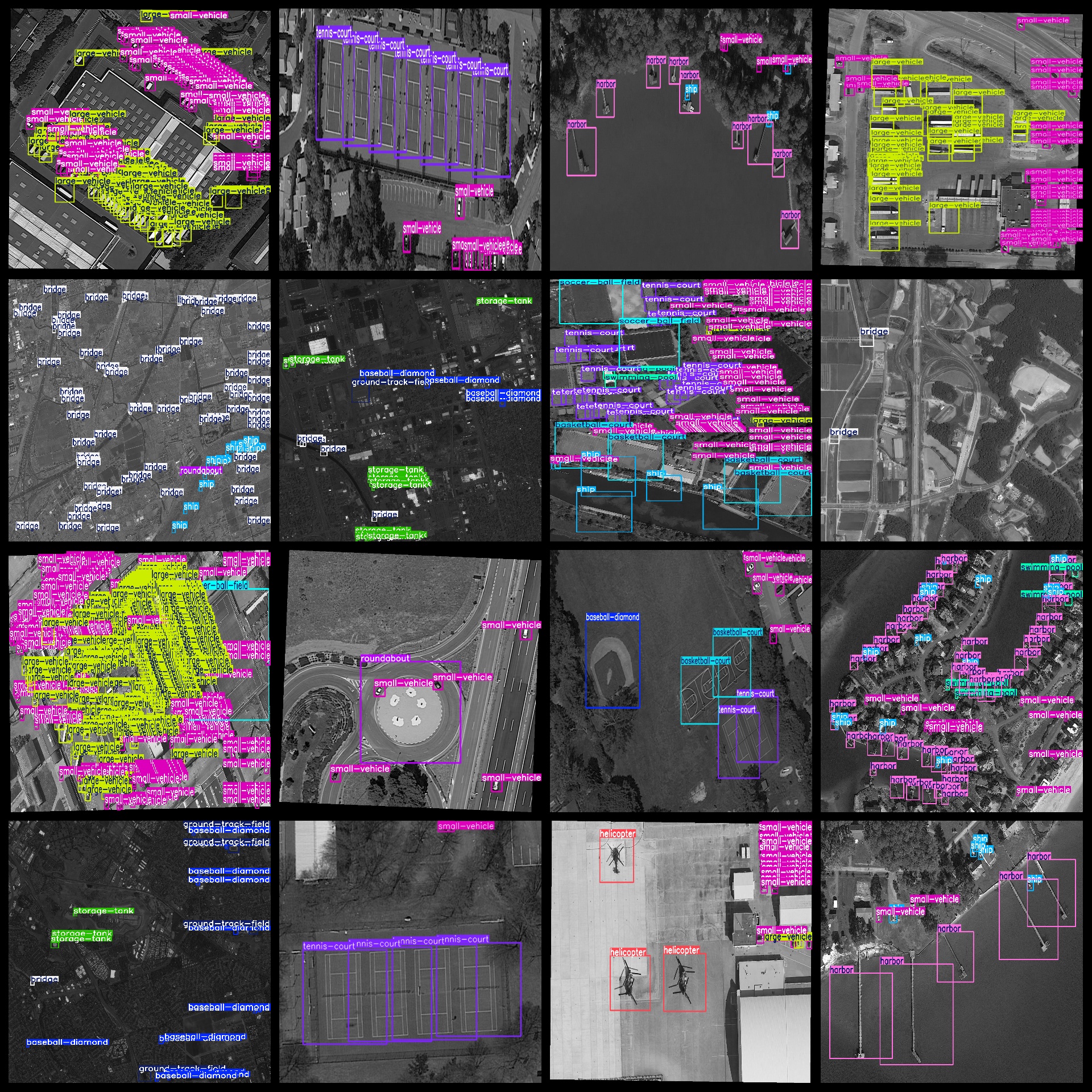 标签名称:["baseball-diamond","basketball-court","bridge","container-crane","ground-track-field","harbor","helicopter","large-vehicle","plane","roundabout","ship","small-vehicle","soccer-ball-field","storage-tank","swimming-pool","tennis-court"]