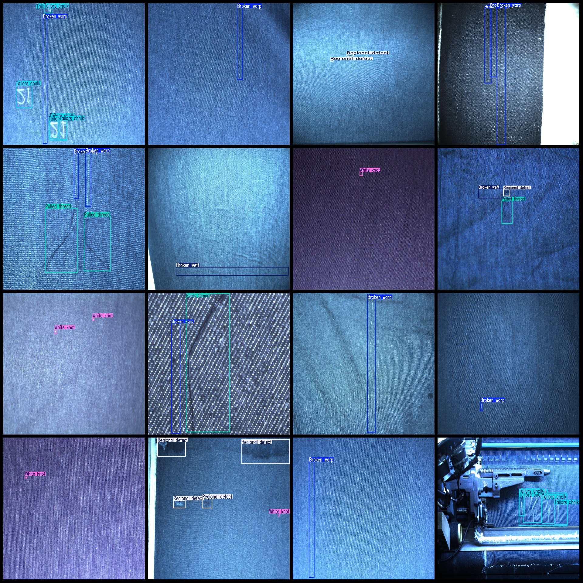 标注类别名称(注意yolo格式类别顺序不和这个对应,而以labels文件夹classes.txt为准):["Aluminum bar","Broken warp","Broken weft","Pulled thread","Regional defect","Tailors chalk","White knot","quxian"]