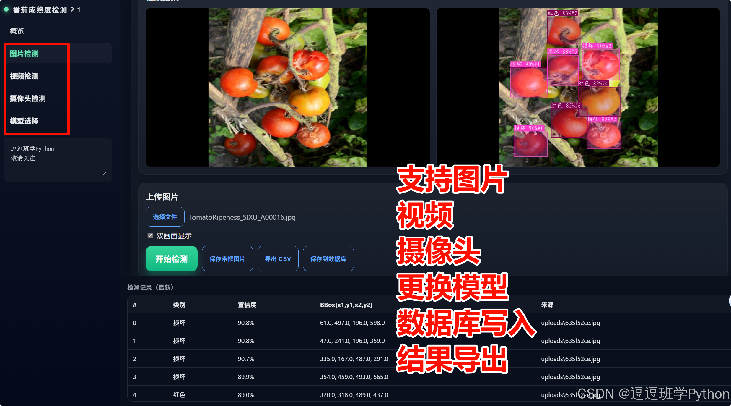 - 检测结果支持 CSV 导出、带框图片 / 视频保存,含登录注册界面并自动写入 SQLite 数据库存档。