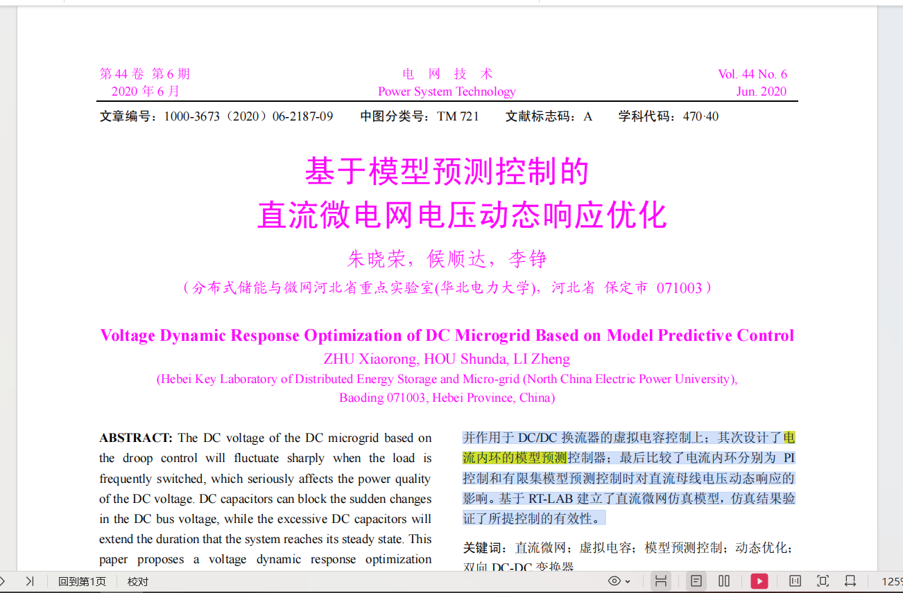 摘要:基于下垂控制的直流微电网在负荷频繁投切时母线电 压会急剧波动,严重影响直流电压的电能质量。直流电容可 以阻碍直流母线电压的突变,但是过大的直流电容又会延长 系统达到稳态的时间。提出了一种基于模型预测控制的直流微电网电压动态响应优化方法,在负荷突变时采用较大的虚拟电容减缓直流电压的变化,在动态响应后期采用较小的虚拟电容使直流电压快速达到稳态。首先给出蓄电池侧虚拟电容的工作原理,通过模型预测控制得到最佳的虚拟电容值,并作用于 DC/DC 换流器的虚拟电容控制上;其次设计了电流内环的模型预测控制器;最后比较了电流内环分别为 PI控制和有限集模型预测控制时对直流母线电压动态响应的影响。基于 RT-LAB 建立了直流微网仿真模型,仿真结果验证了所提控制的有效性。