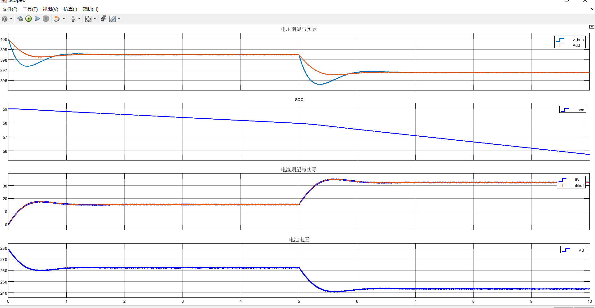 ③仿真工况:在5秒的时候投切负载,可以看到系统响应迅速且跟踪性能好,稳定迅速。