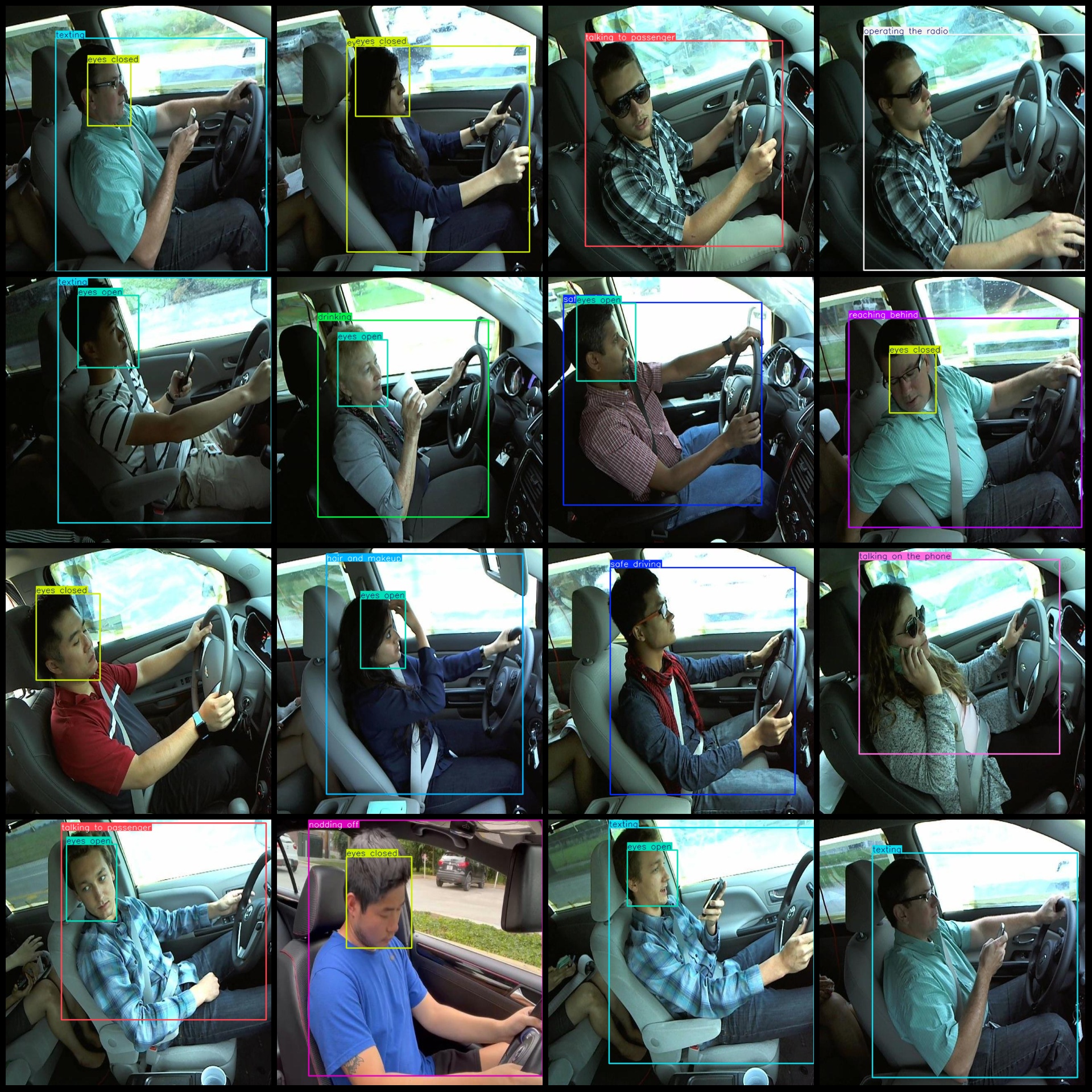 标注类别名称(注意yolo格式类别顺序不和这个对应,而以labels文件夹classes.txt为准):["drinking","eyes closed","eyes open","hair and makeup","nodding off","operating the radio","reaching behind","safe driving","talking on the phone","talking to passenger","texting","yawning"]