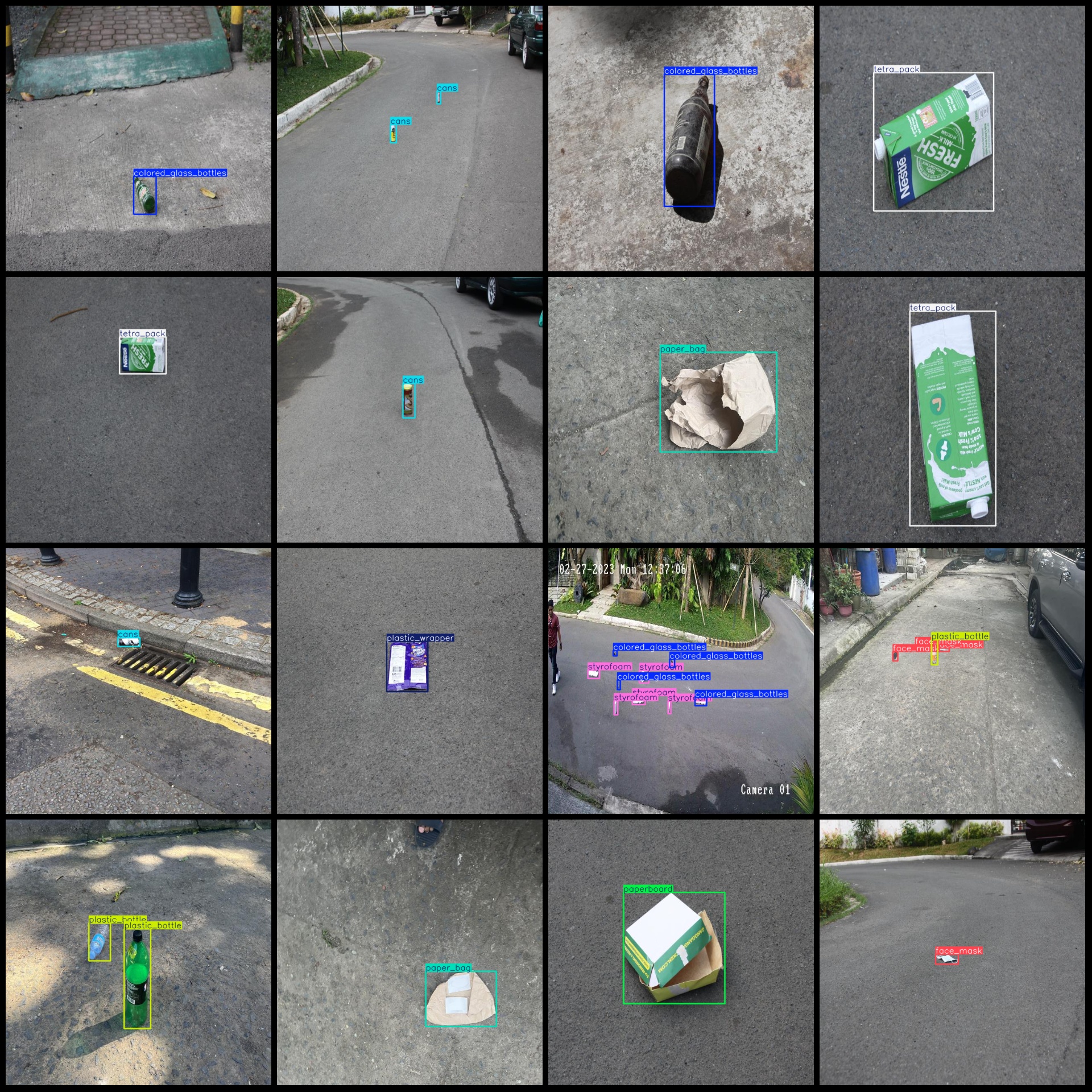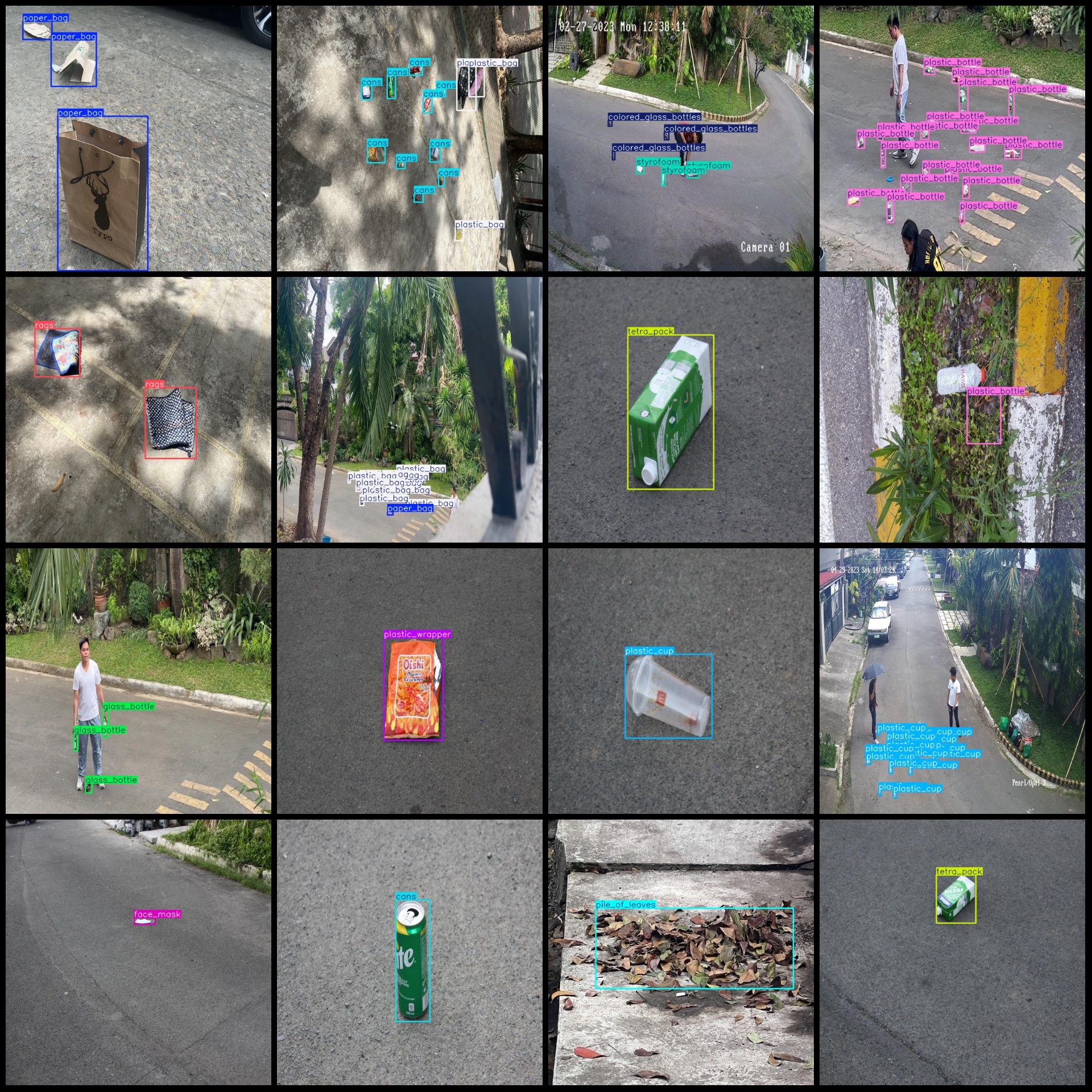 标注类别名称(注意yolo格式类别顺序不和这个对应,而以labels文件夹classes.txt为准):["cans","cardboard","colored_glass_bottles","face_mask","glass_bottle","paper_bag","paper_cup","paperboard","peel","pile_of_leaves","plastic_bag","plastic_bottle","plastic_cup","plastic_wrapper","rags","styrofoam","tetra_pack"]