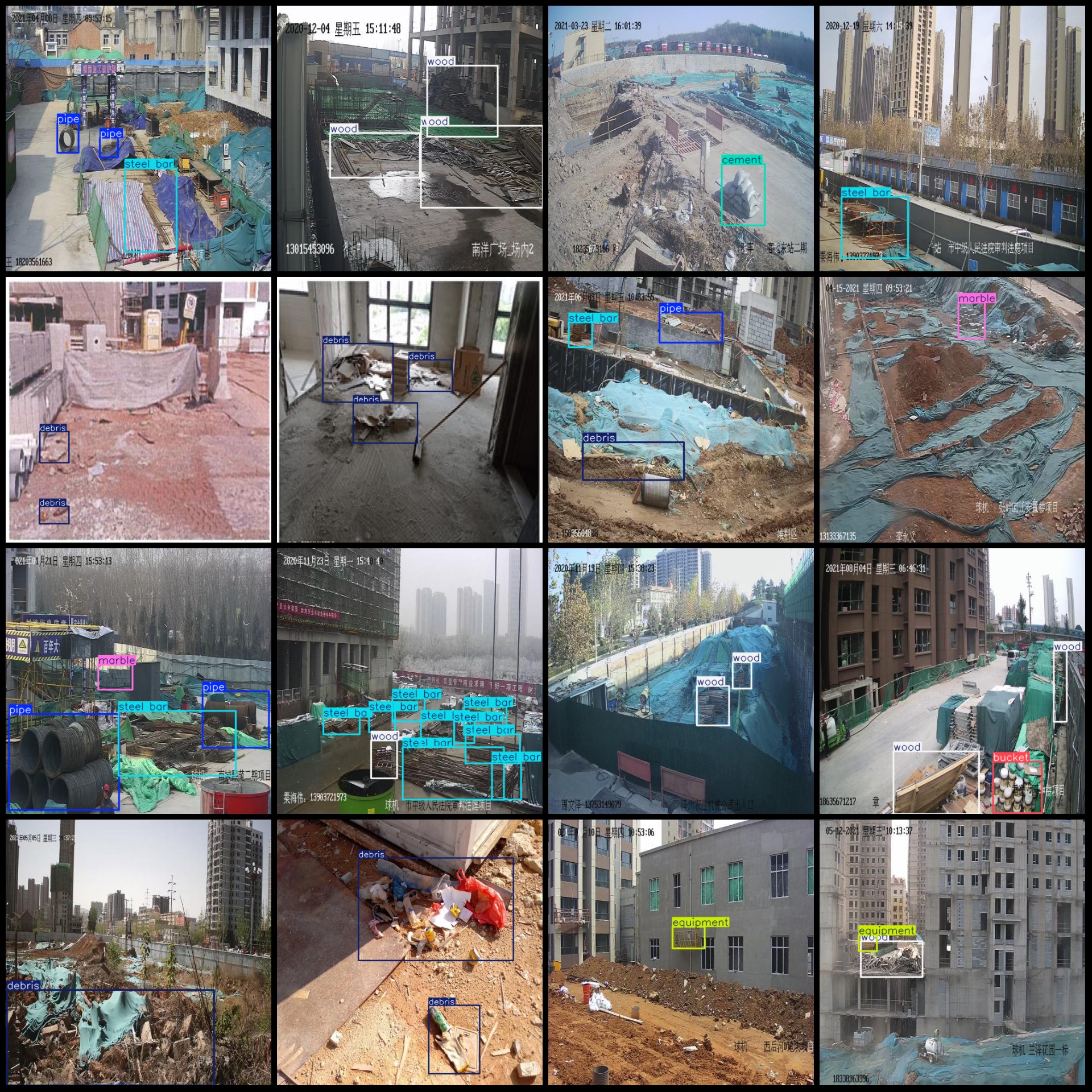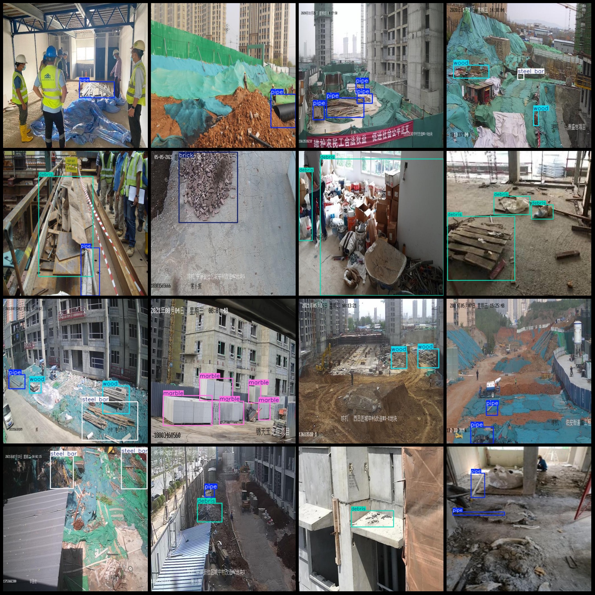 标注类别名称(注意yolo格式类别顺序不和这个对应,而以labels文件夹classes.txt为准):["box","brick","bucket","cement","debris","equipment","marble","pipe","rebar","steel bar","wood"]