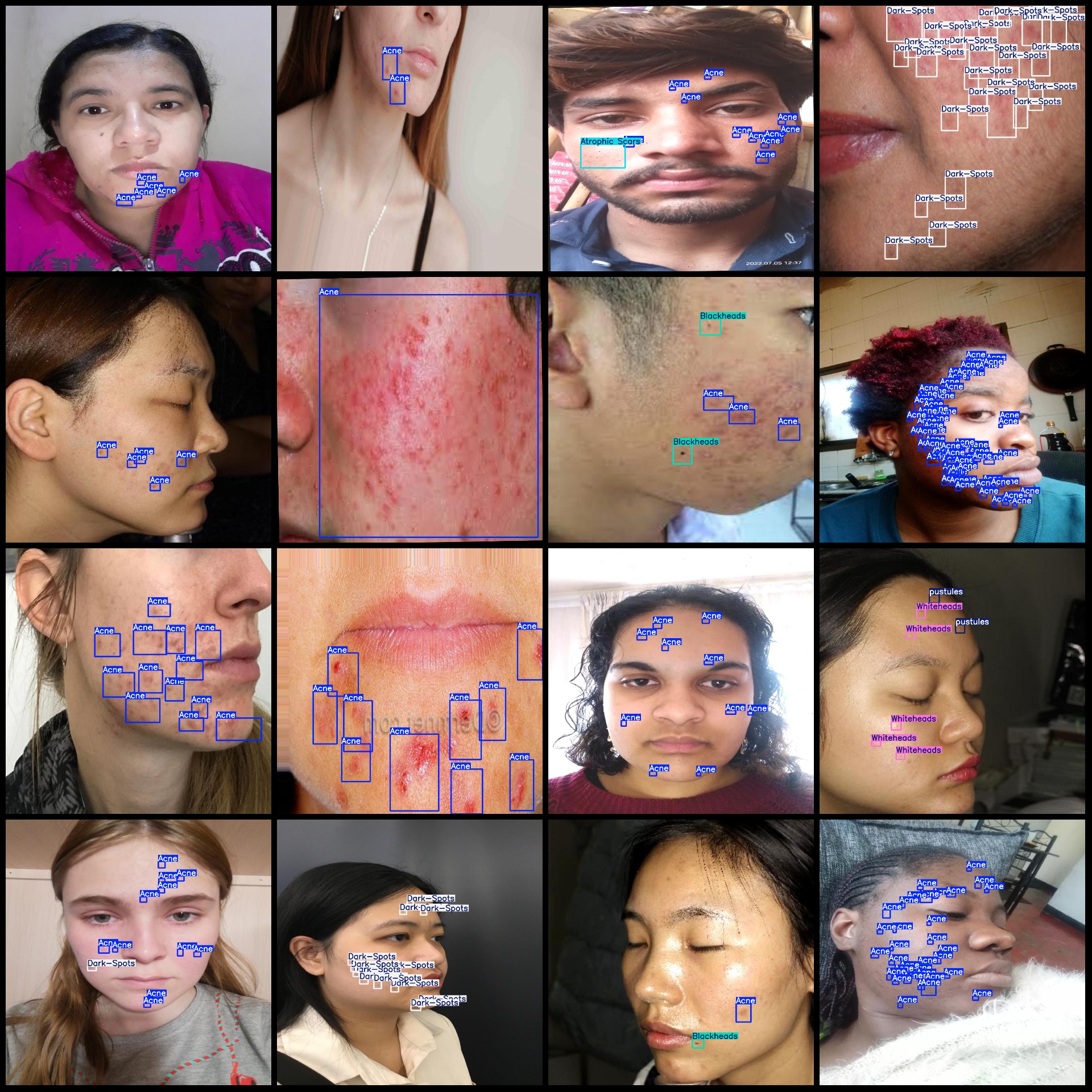 标注类别名称(注意yolo格式类别顺序不和这个对应,而以labels文件夹classes.txt为准):["Acne","Atrophic Scars","Blackheads","Dark-Spots","Englarged-Pores","Whiteheads","black_dots","normal skin","pustules","redness","skin redness"]