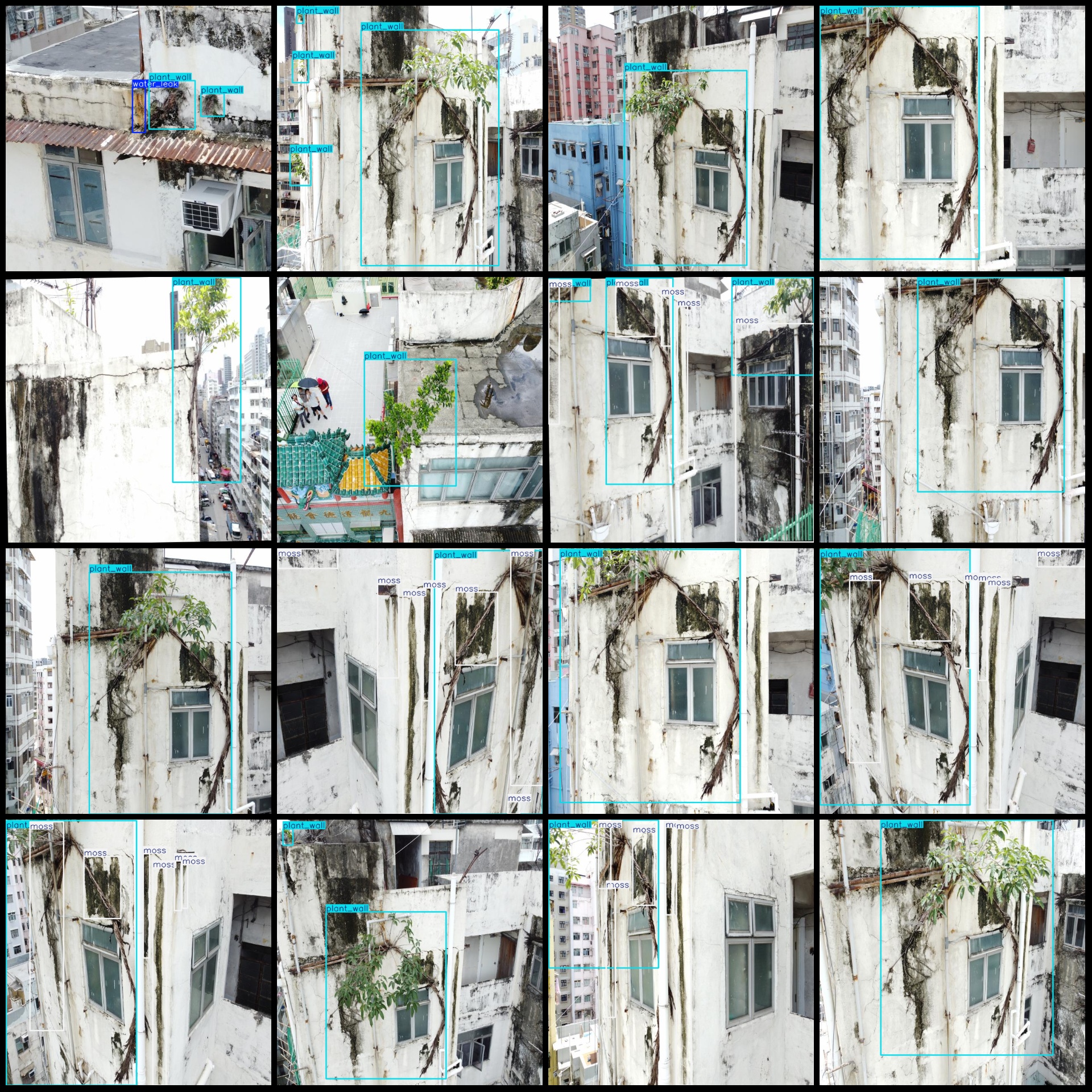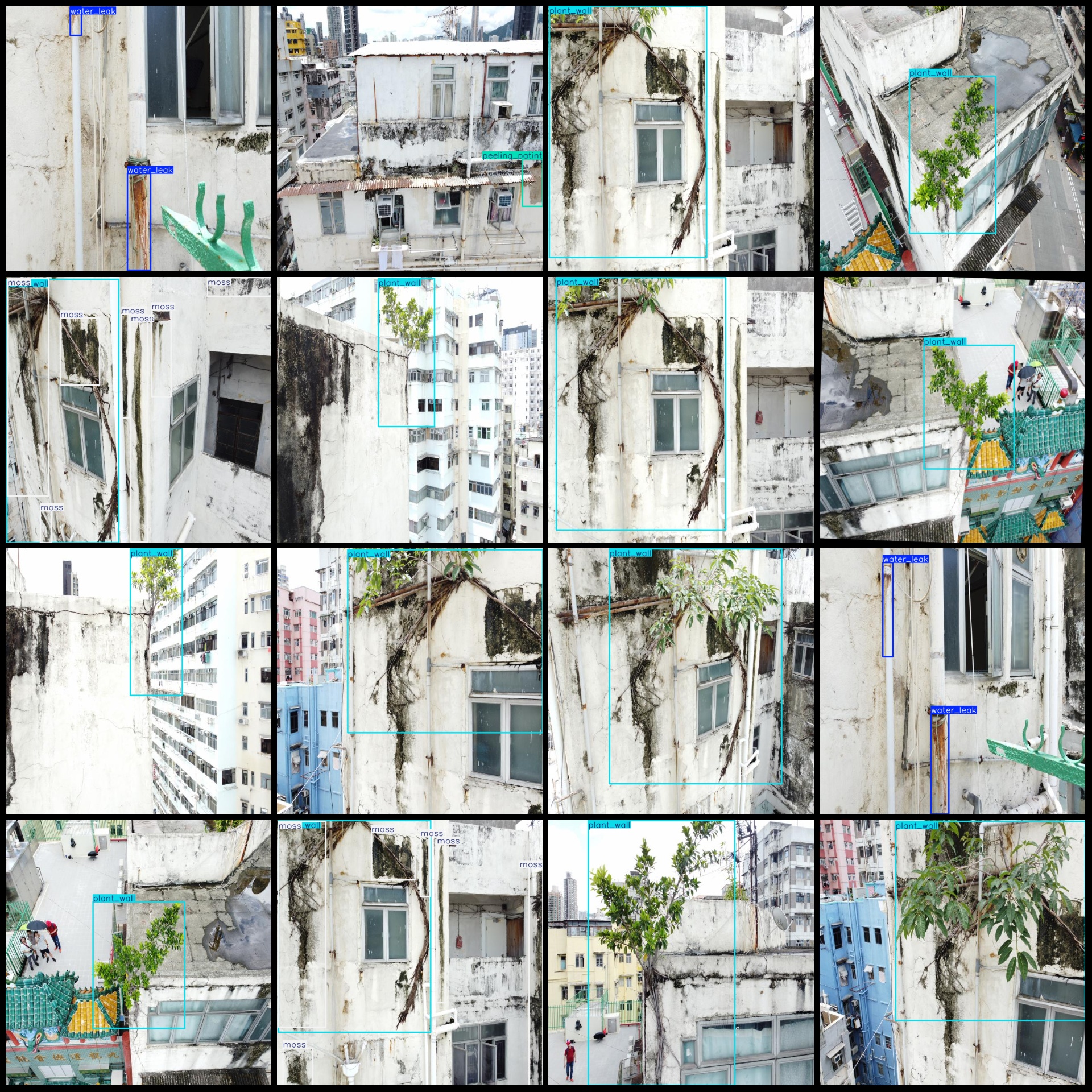 标注类别名称(注意yolo格式类别顺序不和这个对应,而以labels文件夹classes.txt为准):["moss","peeling_patint","plant_wall","water_leak"]