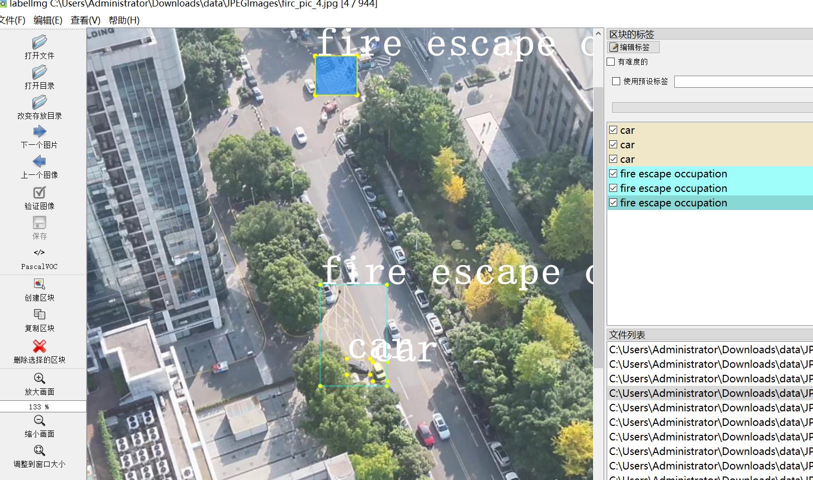 标注类别名称(注意yolo格式类别顺序不和这个对应,而以labels文件夹classes.txt为准):["car","fire escape occupation","non-motorized vehicle"]