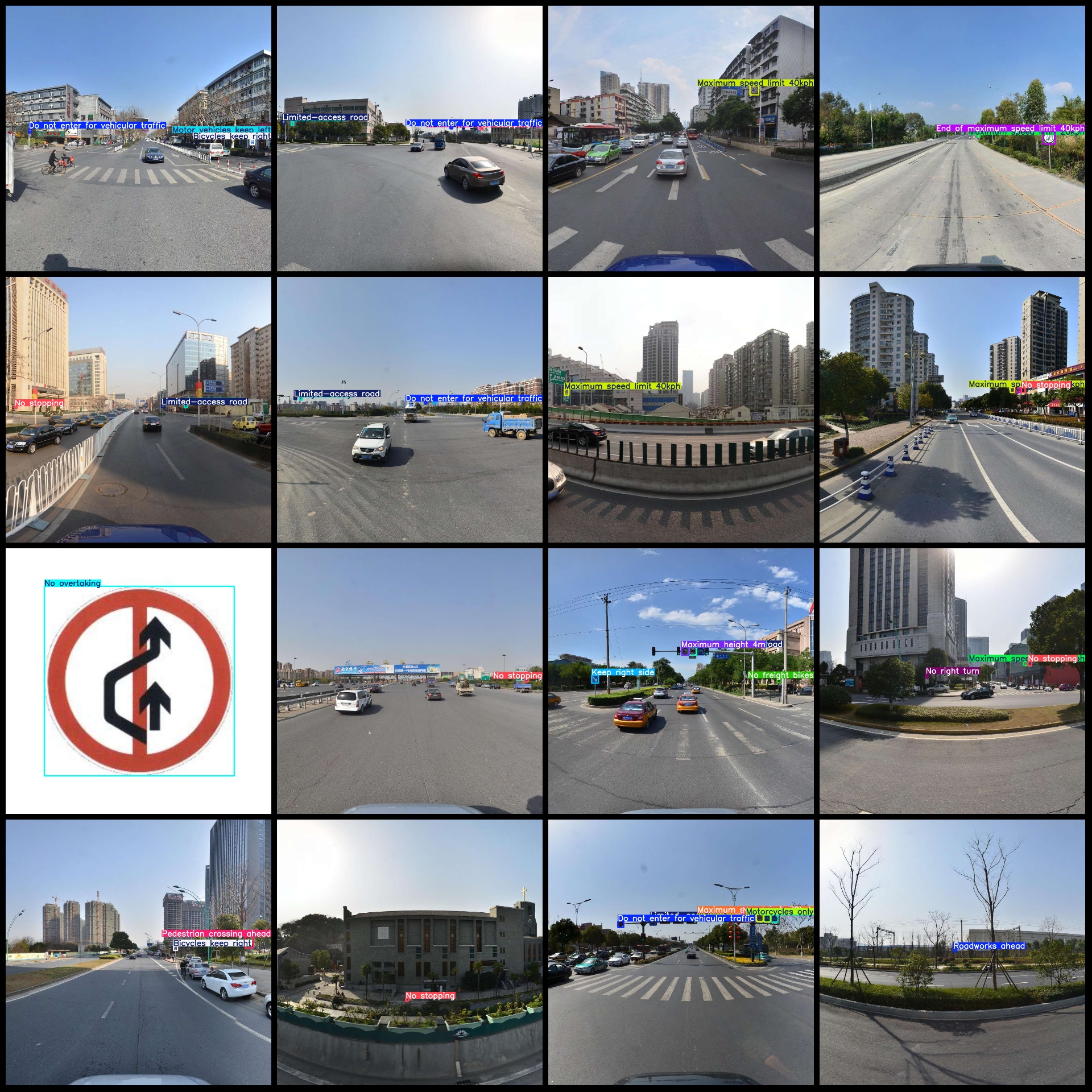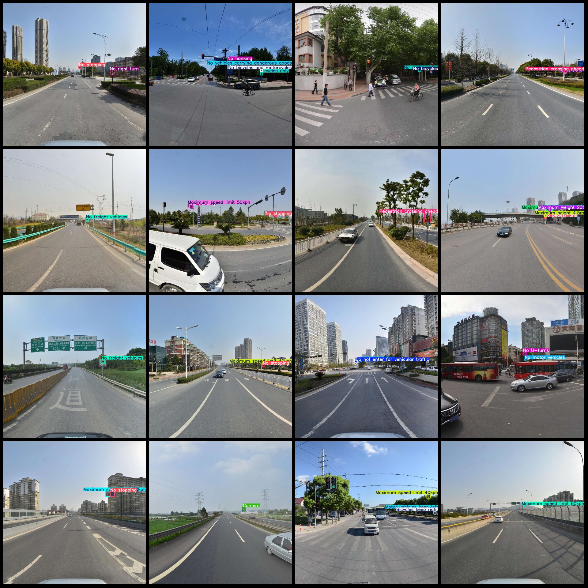 标注类别名称(注意yolo格式类别顺序不和这个对应,而以labels文件夹classes.txt为准):["Accident area","Be careful","Bicycles keep right","Bicycles only","Camera","Children ahead","Control","Cross-village road","Crossroads","Crosswalk","Curve to the left","Curve to the right","Cyclists","Dangerous crosswinds","Dip","Do not enter for vehicular traffic","End of maximum speed limit 10kph","End of maximum speed limit 20kph","End of maximum speed limit 30kph","End of maximum speed limit 40kph","End of maximum speed limit 45kph","End of maximum speed limit 50kph","End of maximum speed limit 60kph","End of maximum speed limit 70kph","End of maximum speed limit 80kph","End of maximum speed limit 100kph","End of overtaking prohibition","Fork road on right rear","Give way","Keep right side","Limited-access road","Maintain Safe Distance","Maximum height 1.8m","Maximum height 2.1m","Maximum height 2.2m","Maximum height 2.4m","Maximum height 2.5m","Maximum height 2.8m","Maximum height 2.9m","Maximum height 2m","Maximum height 3.2m","Maximum height 3.5m","Maximum height 3.8m","Maximum height 3m","Maximum height 4.2m","Maximum height 4.5m","Maximum height 4.8m","Maximum height 4m","Maximum height 5.3m","Maximum height 5.5m","Maximum height 5m","Maximum speed limit 5kph","Maximum speed limit 10kph","Maximum speed limit 15kph","Maximum speed limit 20kph","Maximum speed limit 25kph","Maximum speed limit 30kph","Maximum speed limit 35kph","Maximum speed limit 40kph","Maximum speed limit 50kph","Maximum speed limit 60kph","Maximum speed limit 70kph","Maximum speed limit 80kph","Maximum speed limit 90kph","Maximum speed limit 100kph","Maximum speed limit 110kph","Maximum speed limit 120kph","Maximum weight 2.5t","Maximum weight 2t","Maximum weight 5t","Maximum weight 8t","Maximum weight 10t","Maximum weight 13t","Maximum weight 15t","Maximum weight 20t","Maximum weight 30t","Maximum weight 35t","Maximum weight 40t","Maximum weight 50t","Maximum weight 55t","Maximum weight per axle 6t","Maximum weight per axle 8t","Maximum weight per axle 10t","Maximum weight per axle 12t","Maximum weight per axle 13t","Maximum weight per axle 14t","Maximum weight per axle 18t","Maximum width 2.5m","Maximum width 3.2m","Maximum width 3.5m","Maximum width 3m","Maximum width 4.3m","Maximum width 4.5m","Maximum width 4m","Merging traffic on left","Merging traffic on right","Minimum speed limit 50kph","Minimum speed limit 60kph","Minimum speed limit 70kph","Minimum speed limit 80kph","Minimum speed limit 90kph","Minimum speed limit 100kph","Minimum speed limit 110kph","Motor keep right","Motor vehicles keep left","Motorcycles only","Multiple curves","No U-turns","No bicycles","No bicycles and motorcycles","No bicycles and pedestrians","No buses","No electric tricycles","No entry for both vehicular traffic and pedestrians","No freight bikes","No freight vehicles","No handcarts","No honking","No horse-drawn vehicles","No left and right turns","No left and right turns for busses","No left and right turns for freight vehicles","No left and right turns for motor vehicles","No left turn","No left turn for busses","No left turn for motor vehicles","No motor tricycles","No motor vehicles","No motorcycles","No motorcycles and freight vehicles","No overtaking","No passenger bikes","No pedestrians","No proceed straight","No proceed straight and left turns","No proceed straight and right turns","No proceed straight for freight vehicles","No proceed straight for motor vehicles","No right turn","No right turn for buses","No right turn for motor vehicles","No small passenger vehicles","No stop","No stopping","No tractors","No trailers and truck","No vehicles carrying dangerous goods","Offset road junctions from the right","Overflow road","Pedestrian crossing ahead","Pedestrians only","Proceed straight","Proceed straight or turn left","Proceed straight or turn right","Railroad ahead with safety barriers","Riverbank on left","Road narrows on both sides","Road narrows on right","Roadworks ahead","Roundabout","Side road junction ahead on the left","Side road junction ahead on the right","Slow down","Steep descent","Stop","T-junction ahead","Traffic lights ahead","Tunnel ahead","Turn left","Turn left or right","Turn left or right to detour","Turn on lights for driving through tunnel","Turn right","Two-way traffic ahead","U-turn"]