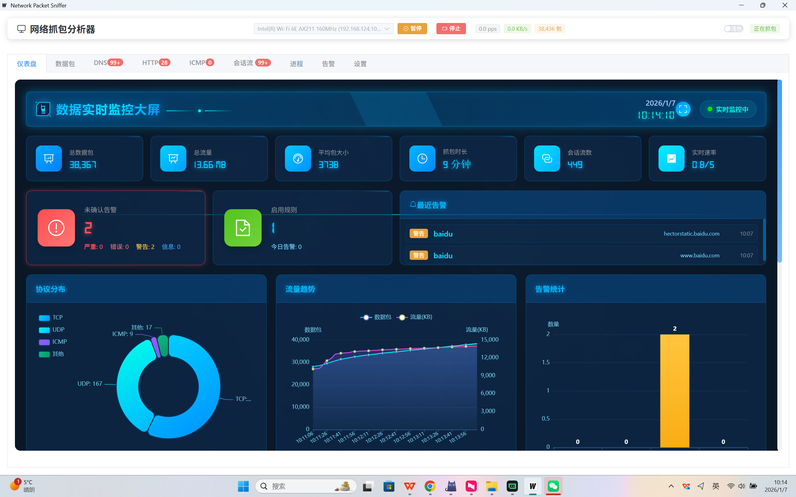 场景描述🔍 网络监控实时监控内网流量,发现异常外联和数据泄露🛡️ 安全威胁分析检测 C2 通信、钓鱼攻击、恶意软件行为📊 流量审计记录所有网络活动,支持取证和合规审计⚡ 性能诊断分析网络瓶颈、异常流量、协议分布🛠️ 开发调试抓包分析 HTTP/DNS/ICMP 等协议细节🔬 安全研究恶意样本行为分析、IOC 提取