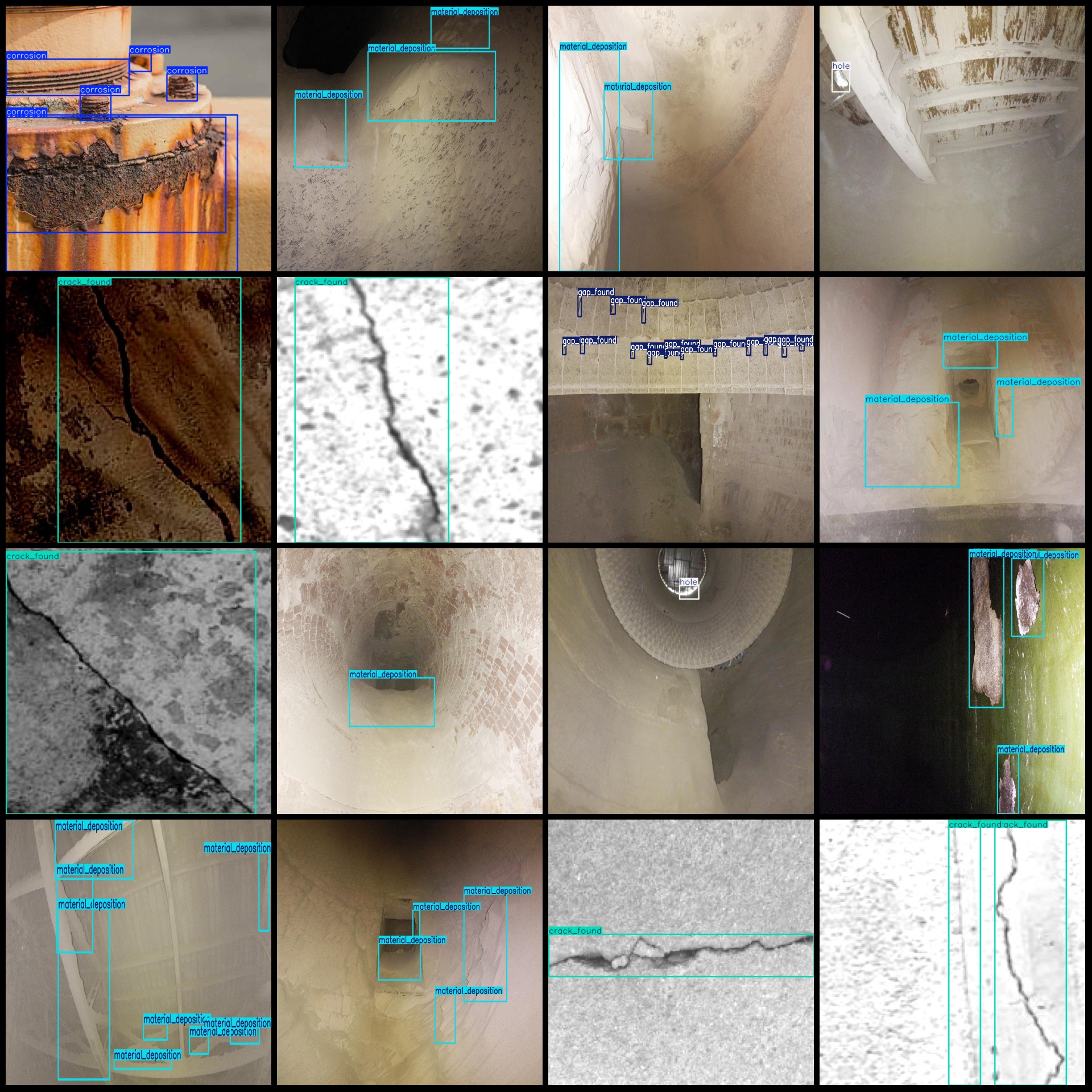 标注类别名称(注意yolo格式类别顺序不和这个对应,而以labels文件夹classes.txt为准):["corrosion","crack_found","gap_found","hole","material_deposition"]