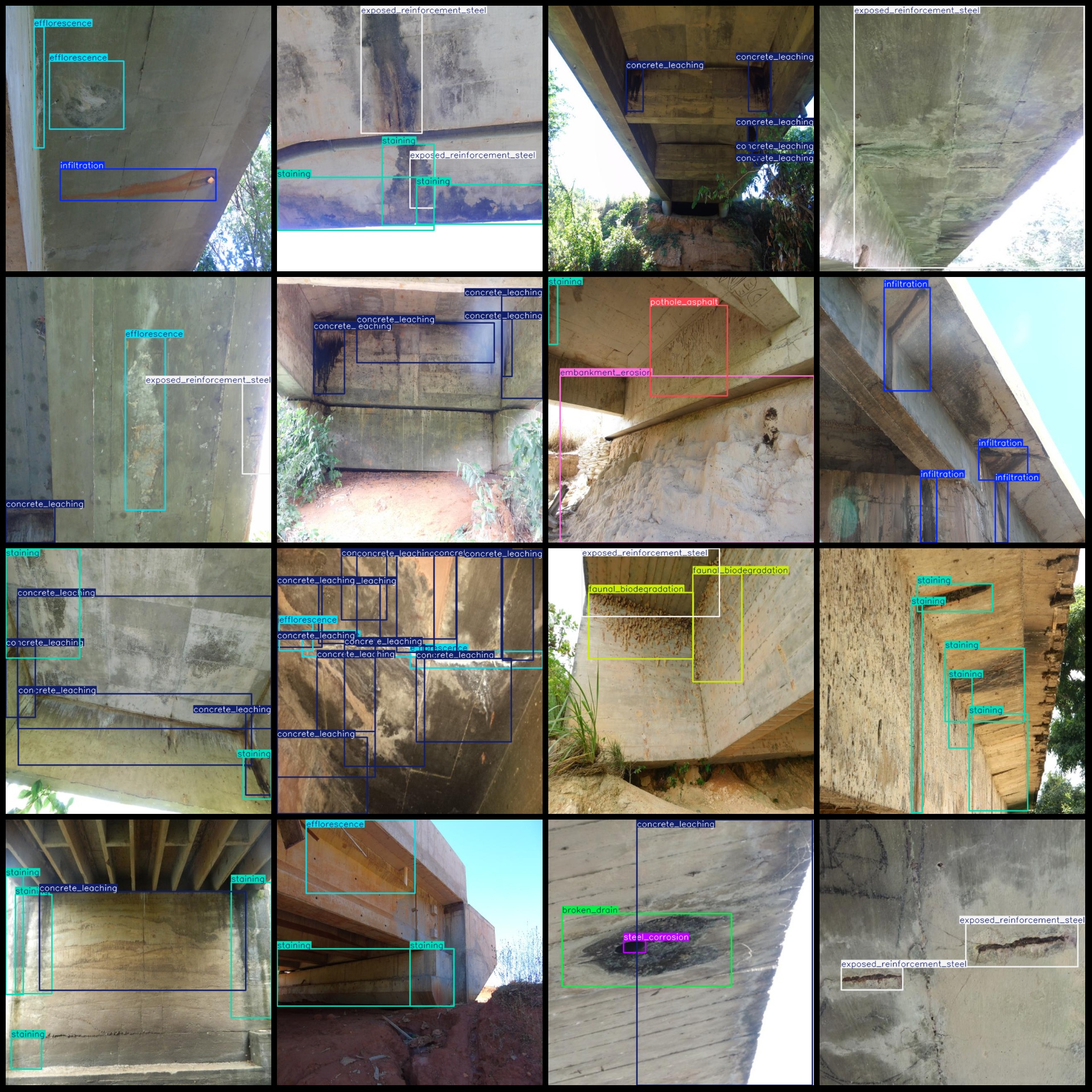 标注类别名称(注意yolo格式类别顺序不和这个对应,而以labels文件夹classes.txt为准):["broken_drain","concrete_leaching","crack","deep_crack","disaggregation_of_concrete","efflorescence","embankment_erosion","expansion_joint","exposed_reinforcement_steel","faunal_biodegradation","fire_damaged","formwork_niche","guardrail_damaged","infiltration","pothole_asphalt","rutting_pavement_failure","staining","steel_corrosion"]