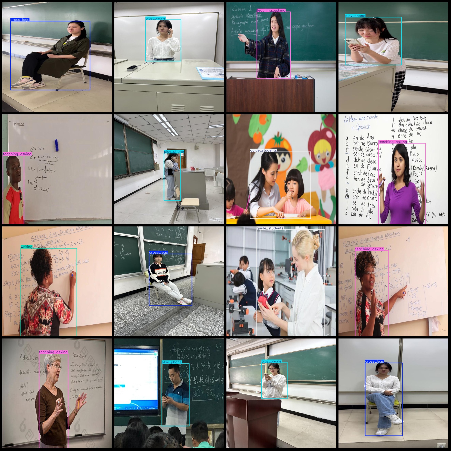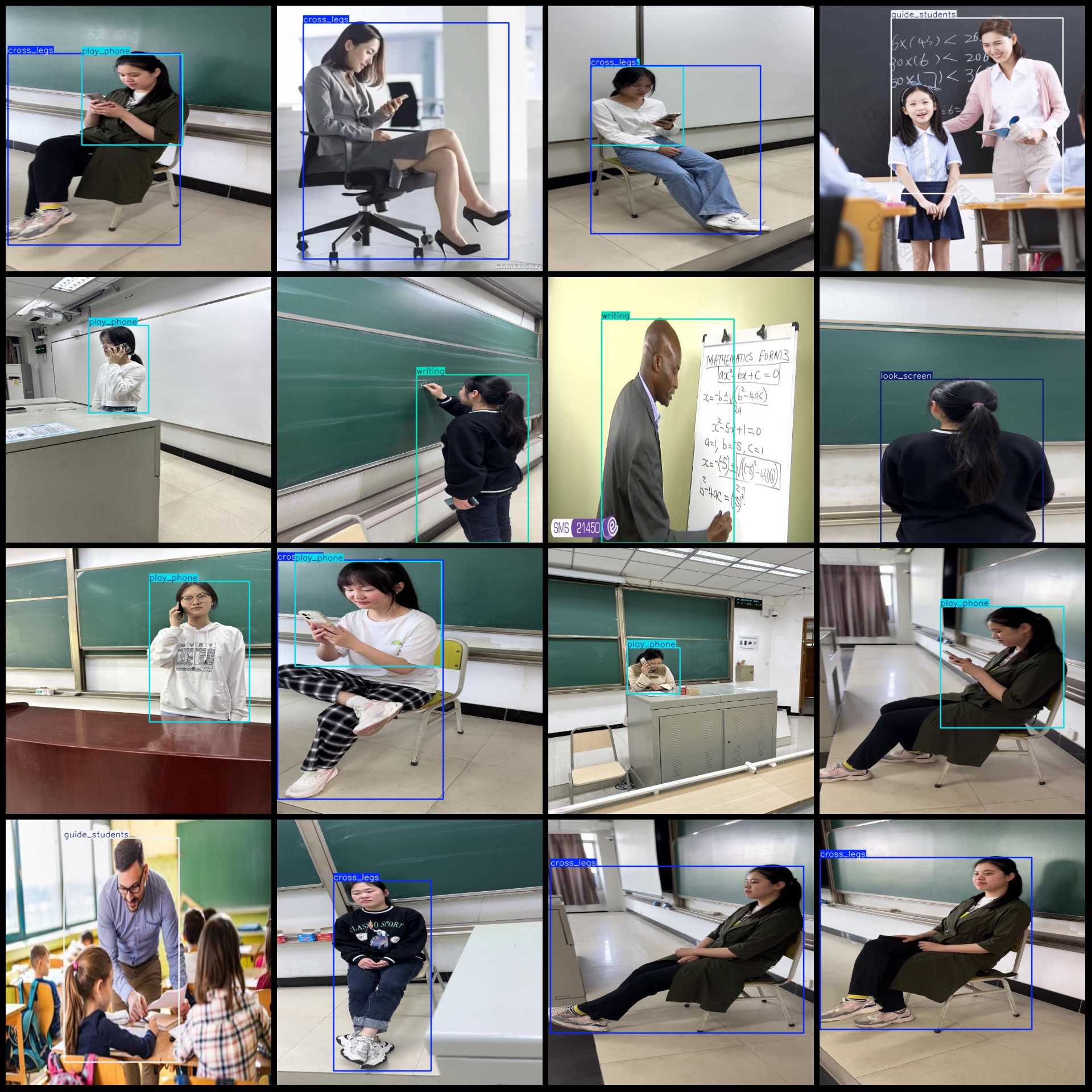 标注类别名称(注意yolo格式类别顺序不和这个对应,而以labels文件夹classes.txt为准):["cross_legs","guide_students","look_screen","play_phone","teaching_asking","writing"]