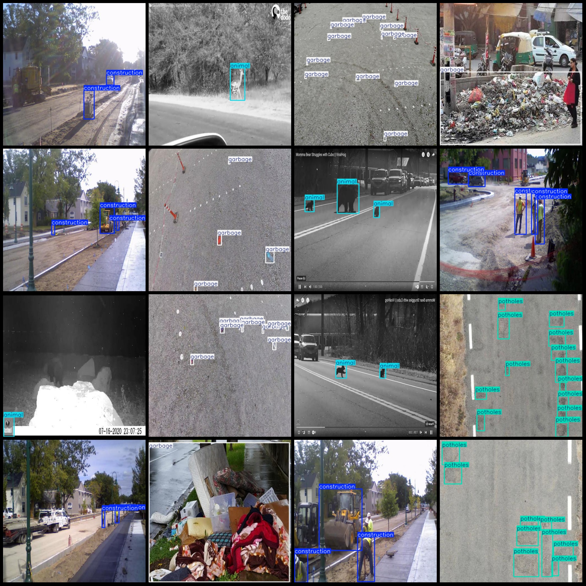 标注类别名称(注意yolo格式类别顺序不和这个对应,而以labels文件夹classes.txt为准):["animal","car_accident","construction","garbage","potholes"]