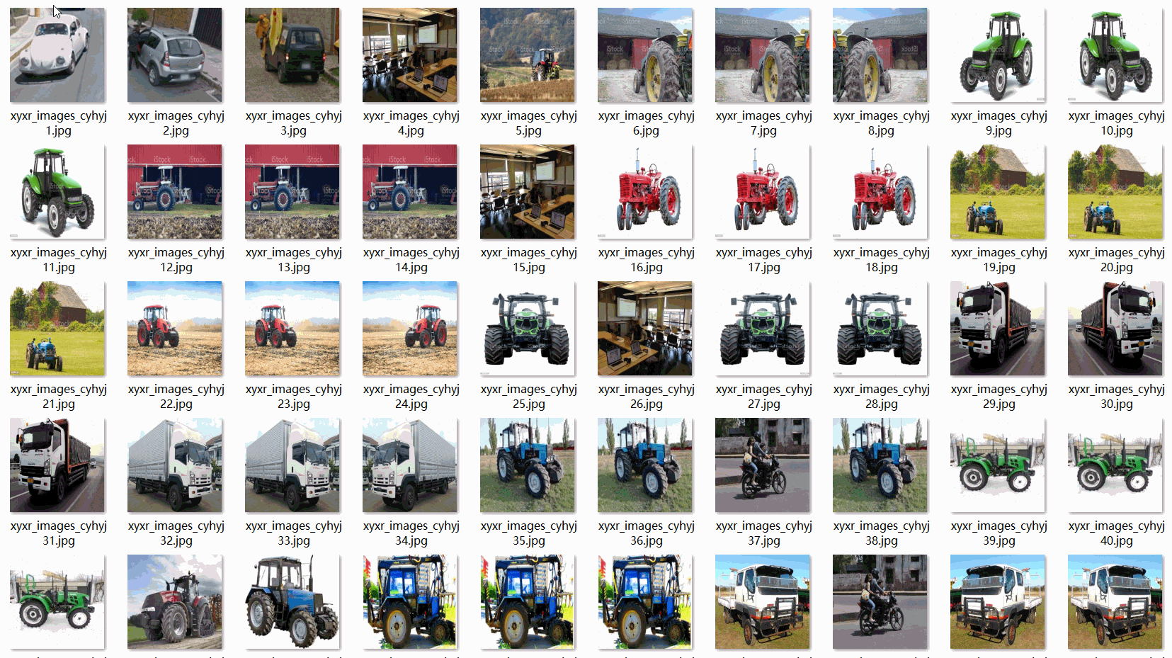 标签中文对照:["农业机械","公共汽车","汽车","收割机","人","拖拉机","卡车"]