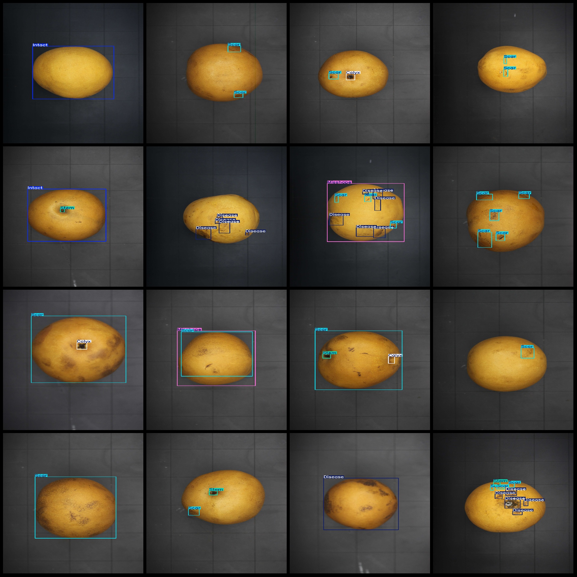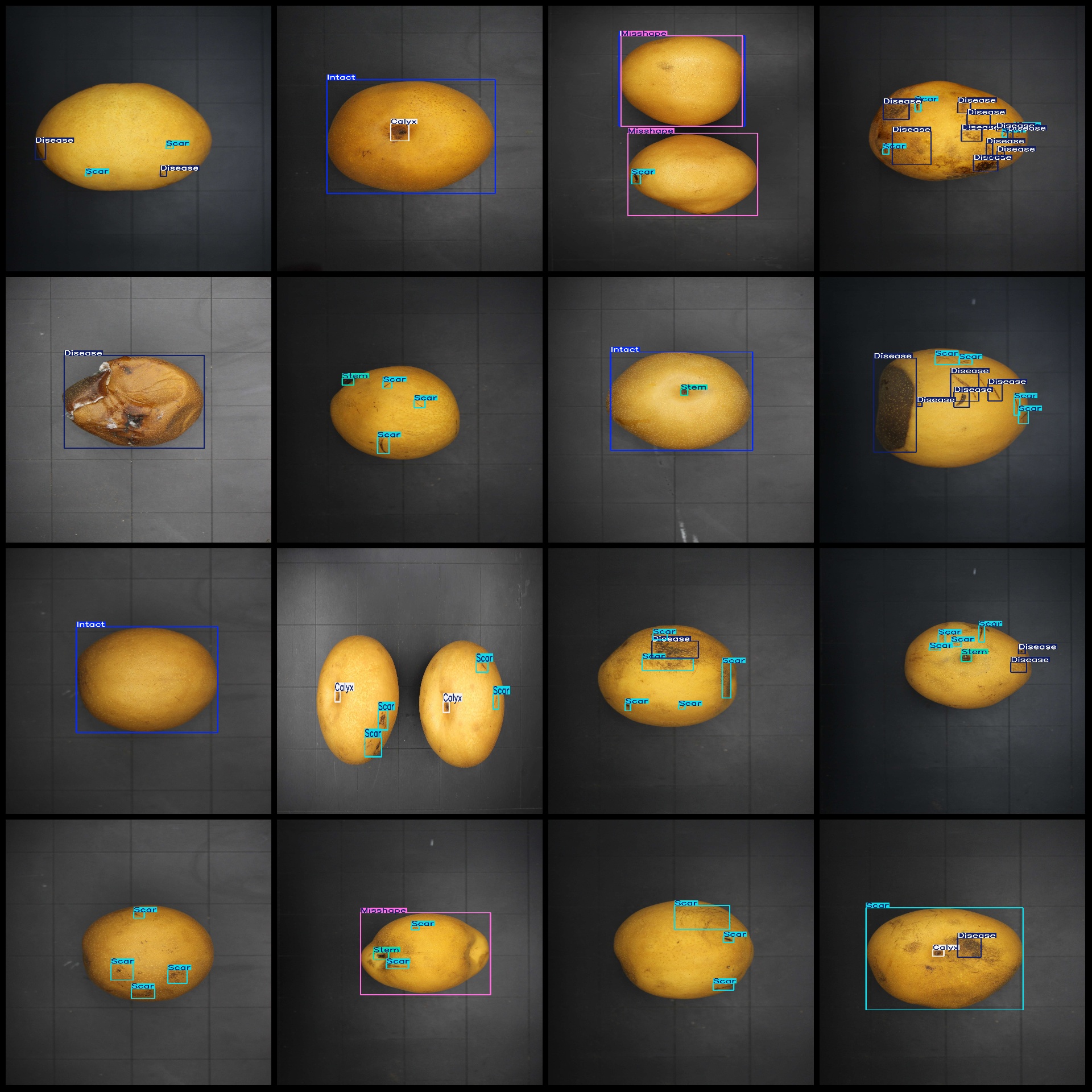 标注类别名称(注意yolo格式类别顺序不和这个对应,而以labels文件夹classes.txt为准):["Calyx","Disease","Intact","Miscolor","Misshape","Scar","Stem"]