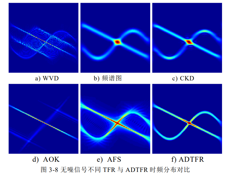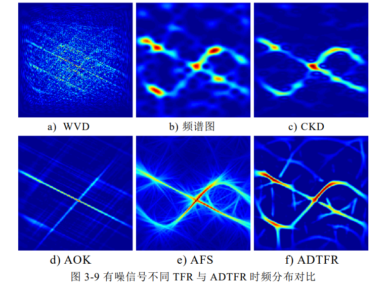 仿真验证表明,无论有无噪声干扰,ADTFR相比传统的WVD、频谱图、CKD等时频分析方法,均能获得更高的时频分辨率,且能有效抑制交叉项,清晰呈现多分量信号的时频结构。