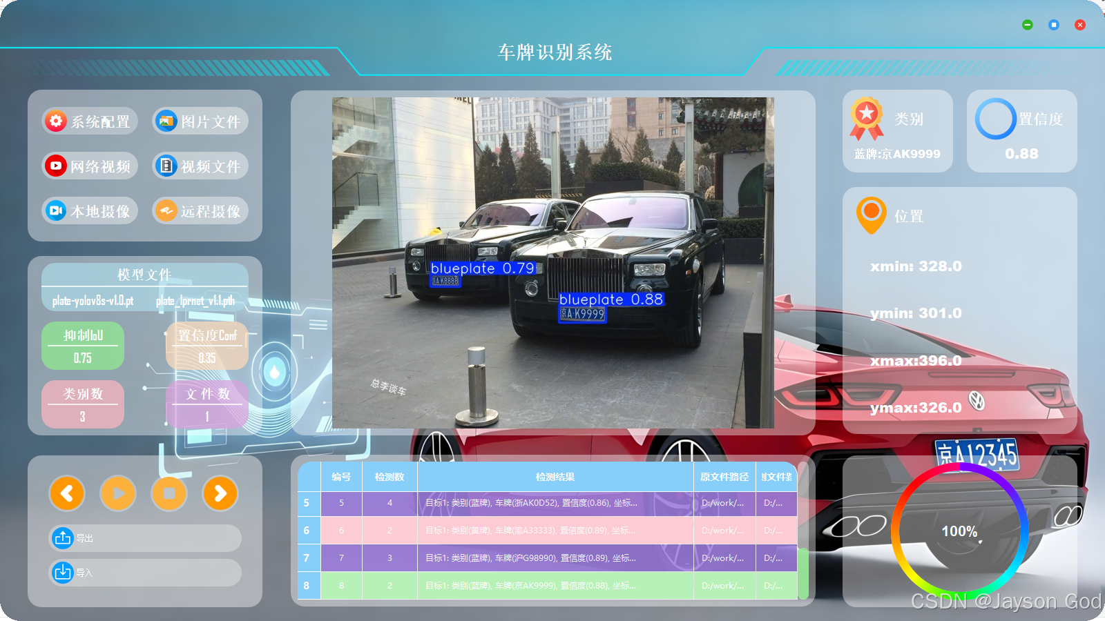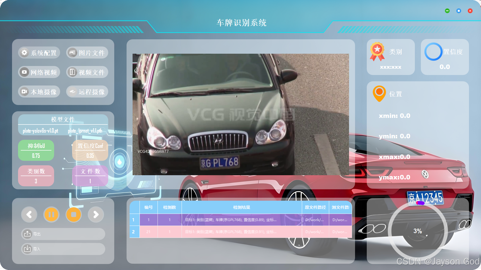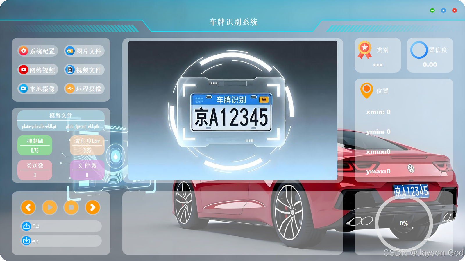 本项目是一个功能完整、界面友好的车牌识别(License Plate Recognition, LPR)软件,采用 Python 开发,融合了深度学习与图形界面技术,适用于图像、视频、摄像头及网络流等多种输入场景。