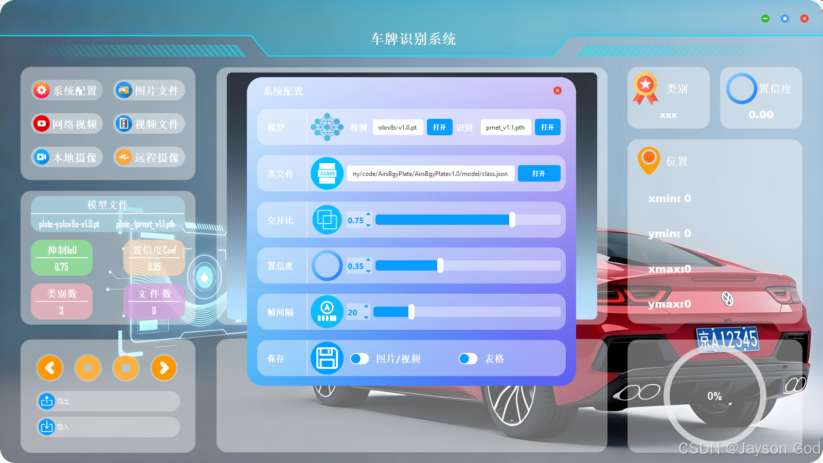 前端界面基于 PyQt5 构建,提供直观的操作面板:支持图片/视频文件加载、实时摄像头预览、RTSP 网络流接入,并能动态展示识别结果、置信度、IOU 等关键信息。同时,软件内置配置管理模块,可保存用户偏好设置(如模型路径、识别阈值等),提升使用体验。