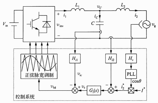 下图给出了单相LCL型并网逆变器及其控制结构。其中,L1为逆变器侧电感,C为滤波电容,L2为网侧电感,它们构成LCL滤波器。对并网逆变器而言,其首要目标是控制并网电流i2,使其与电网电压vg同步,并使其幅值跟踪给定值参考电流值I*。通常,Ug的相位由锁相环(phase-lockedloop,PLL)获得,I*由外部电压环产生。由于电压环的响应速度远低于并网电流环,可以对并网电流环进行单独分析。在下图Hi1和H2分别为电容电流ic和并网电流i2(ig也指并网电流)的采样系数。I2 的采样信号与其指令值参考电流i*进行比较,得到的误差信号送人电流调节器Gi(s)(这里采用PID调节器)。 通过反馈电容电流ic实现LCL滤波器谐振尖峰的有源阻尼。从G,(s)的输出vr,中减去ic的反馈信号vic ,得到调制波vm。