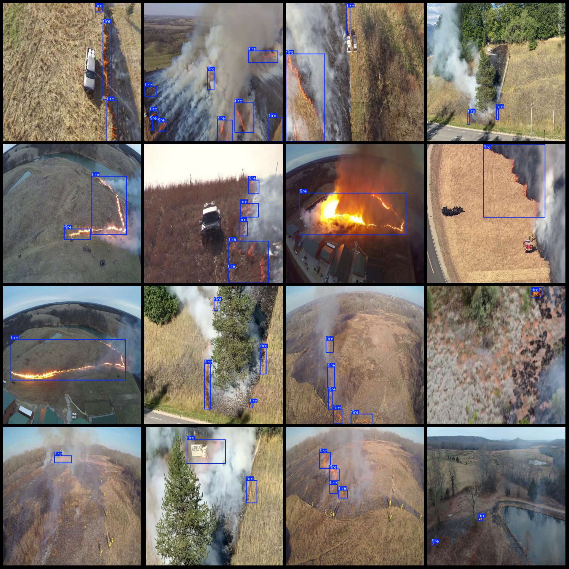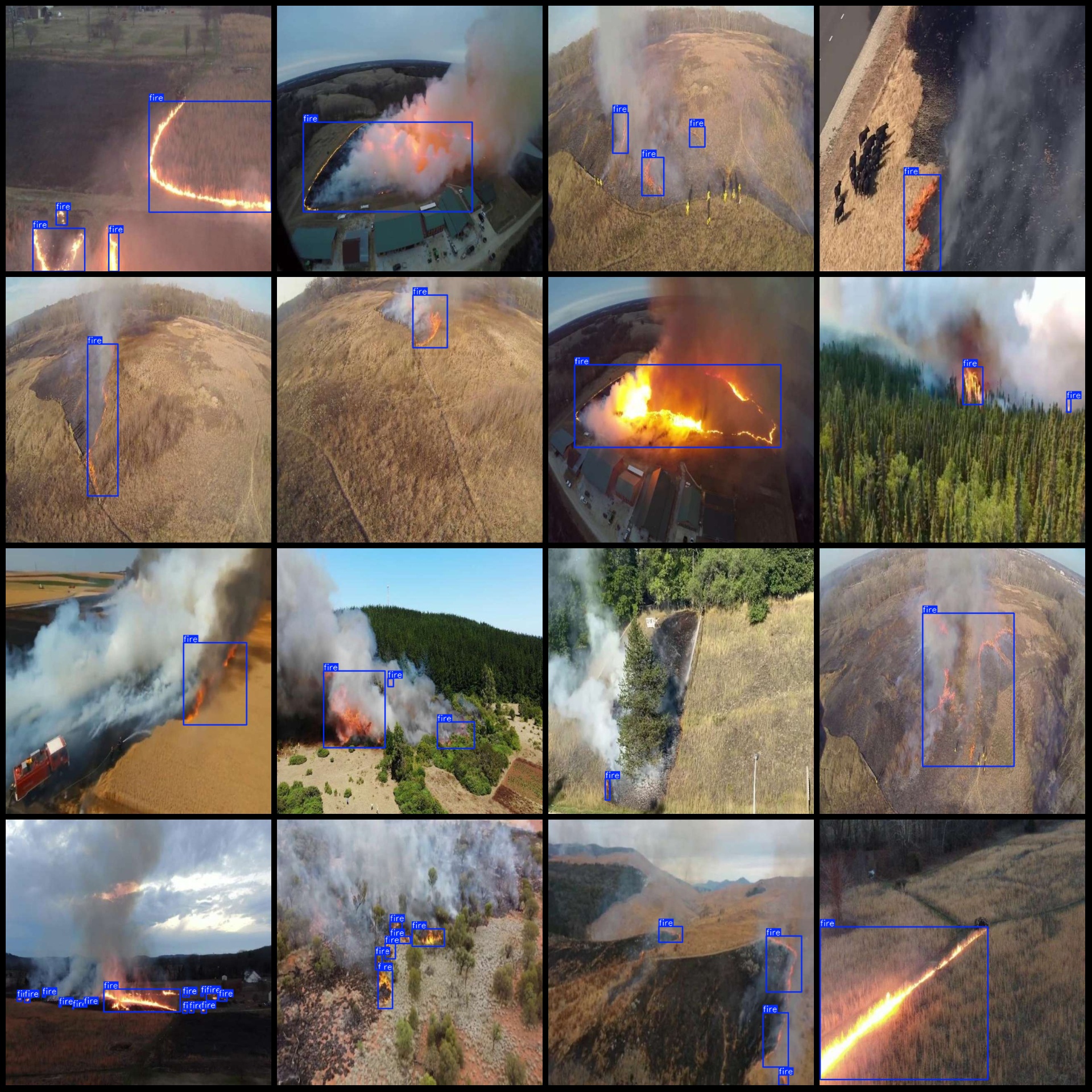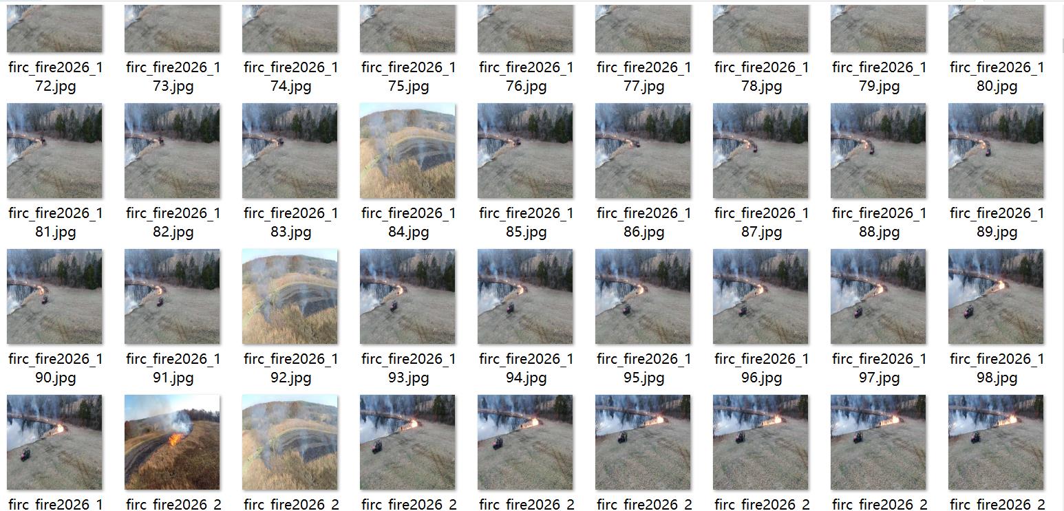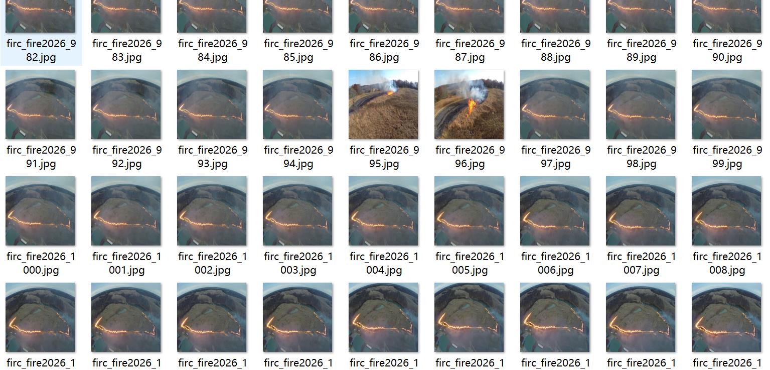 注意数据集中有多段视频抽取而成,所以看起来图片重复(实际是连续帧),只标注了火点,没有标注烟雾