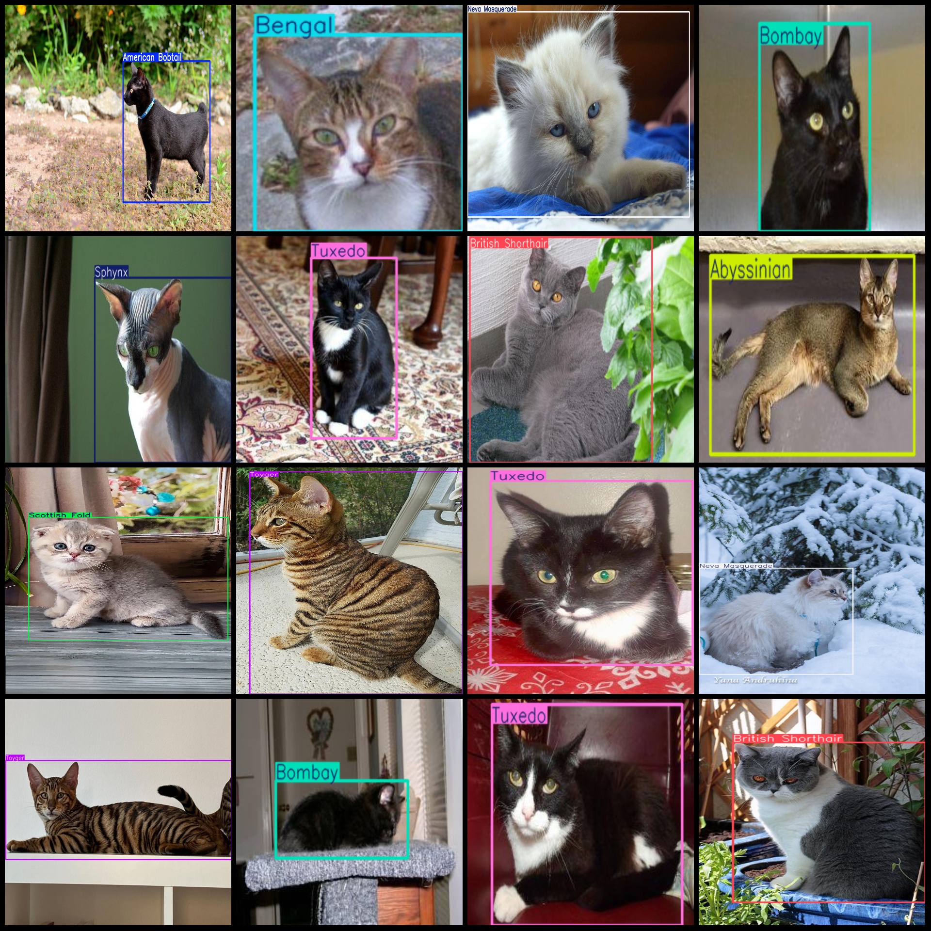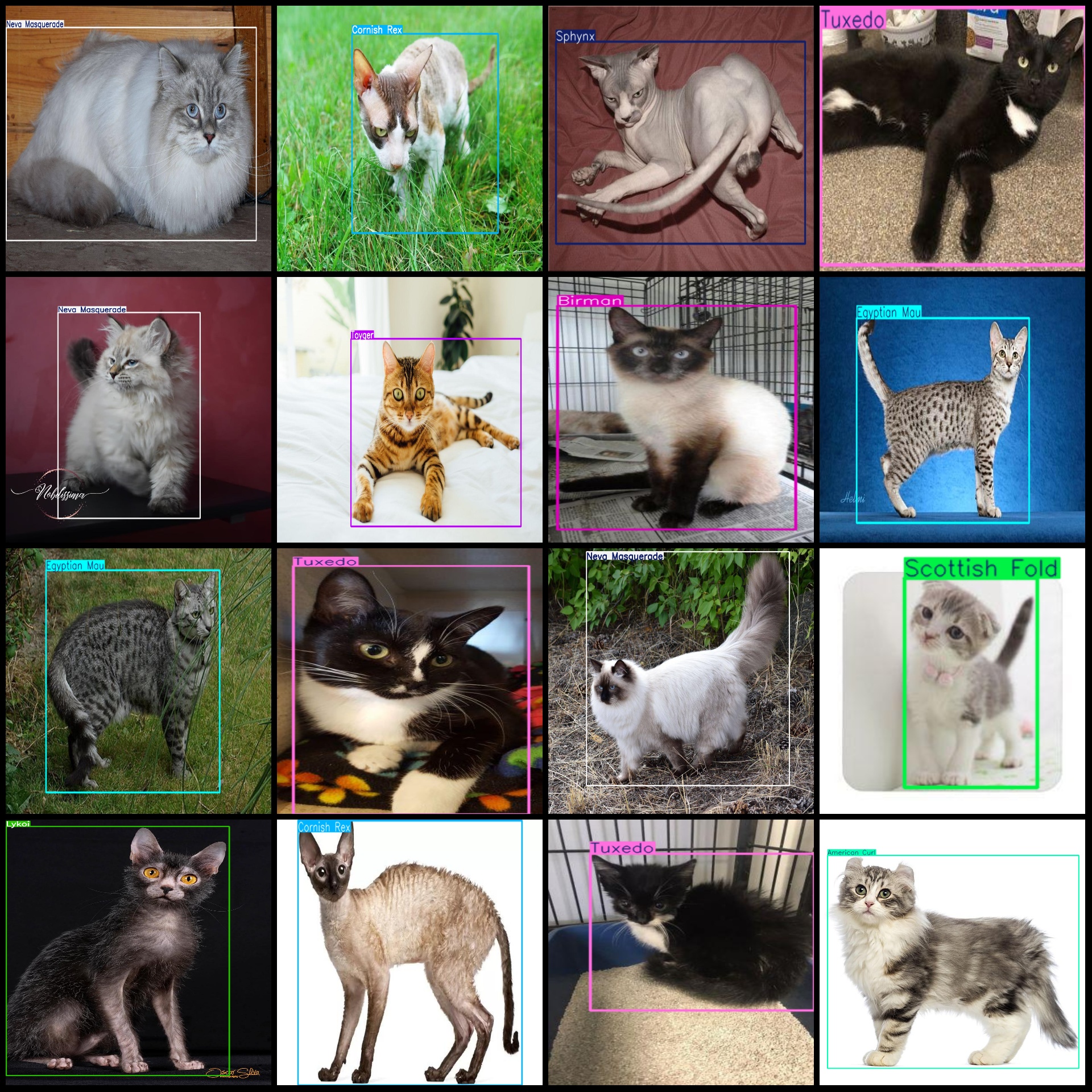 标注类别名称(注意yolo格式类别顺序不和这个对应,而以labels文件夹classes.txt为准):["Abyssinian","American Bobtail","American Curl","Bengal","Birman","Bombay","British Shorthair","Cornish Rex","Egyptian Mau","Khao Manee","Lykoi","Maine Coon","Munchkin","Neva Masquerade","Oriental","Persian","Ragdoll","Russian Blue","Savannah","Scottish Fold","Siamese","Sphynx","Toyger","Tuxedo"]