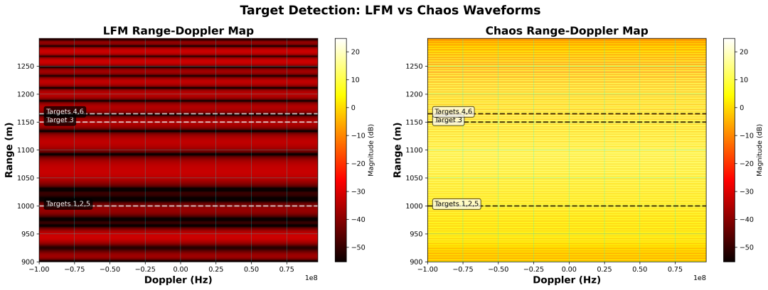 - 可解混沌波形的优势:通过解析解消除了同步需求,提供了 -25 dB 的低旁瓣和图钉状模糊函数,有效提升了系统的固有动态范围。