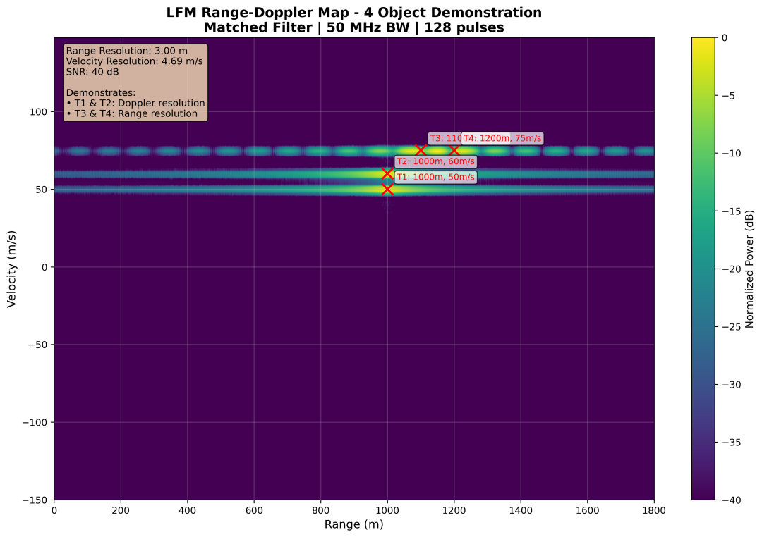 - 快速强目标 T3, T4 丢失:由于 LFM 的距离-多普勒耦合,加上 FFT 的频谱泄漏,导致快速目标在距离-多普勒图上的 SNR 严重下降。