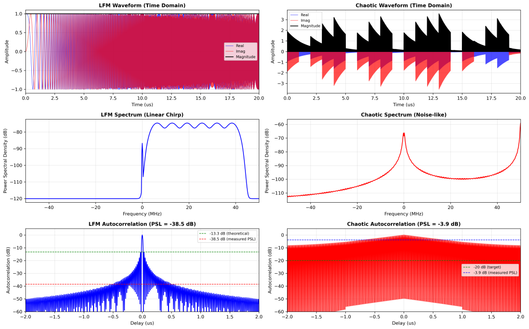 - 可解混沌波形:通过引入具有解析解的混沌系统,在无需发射机与接收机严格同步的前提下,生成具有低旁瓣(PSL ≈ -25 dB)且无距离-多普勒耦合的雷达波形。