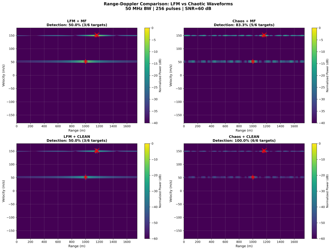 - 混沌波形提供了必要的低初始旁瓣水平(-25 dB),使得弱目标信号相对于强目标旁瓣的比值得以提升,为 CLEAN 算法提供了有效的“起跑线”。