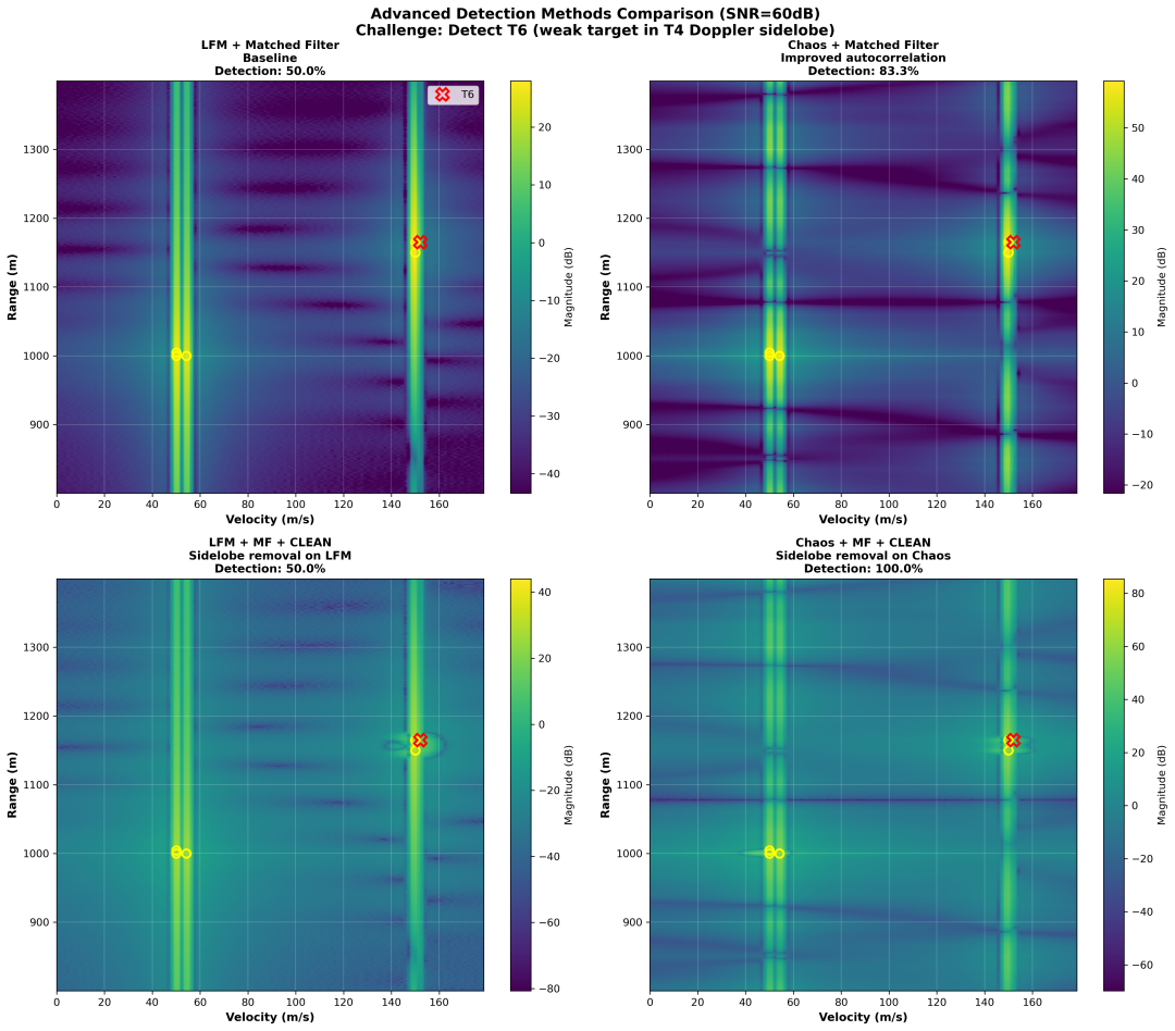 - T6 未检测:虽然混沌旁瓣已降至 -25 dB,使 T6 的信噪比提升了约 12 dB,但在没有 CLEAN 辅助的情况下,T6 的信号强度仍略低于典型检测阈值(信杂比约为 12 dB),处于“可见但不可信”的状态。