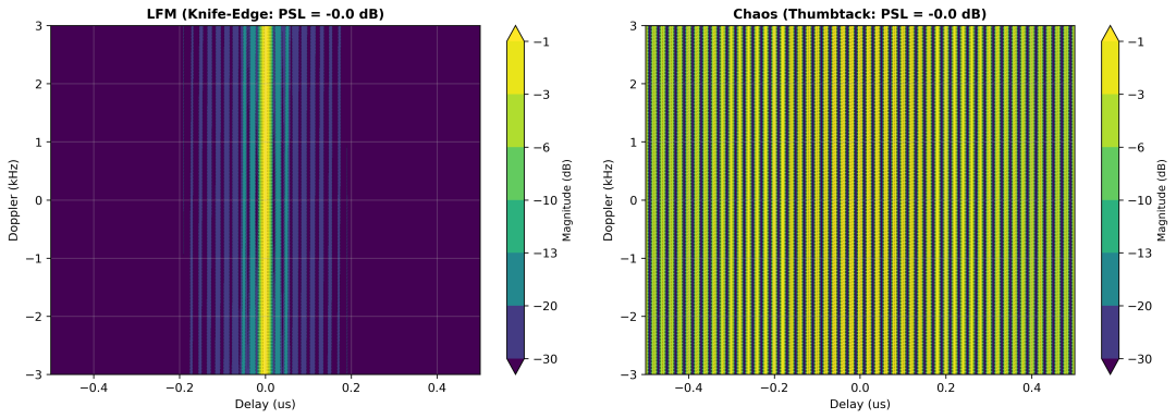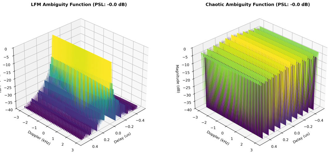 - 图钉状模糊函数:不像 LFM 的刀刃状,可解混沌的模糊函数近似为原点尖锐、周围平坦的“图钉状”。