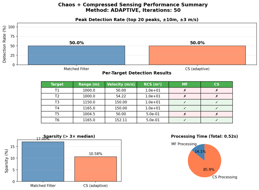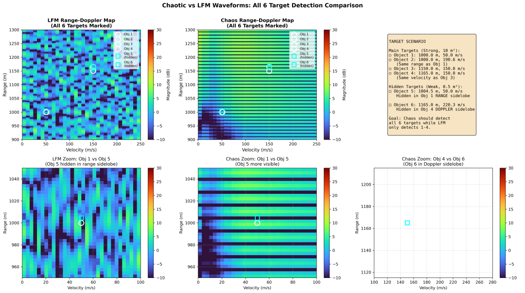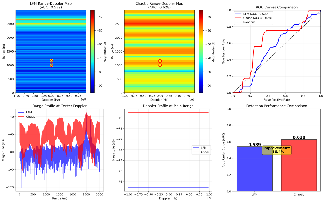 - 卓越的检测性能:在 26 dB 动态范围的极端挑战场景下,"可解混沌 + CLEAN" 方案实现了 100% 的目标检测率,相比 LFM 基准方案(50%)实现了质的飞跃。