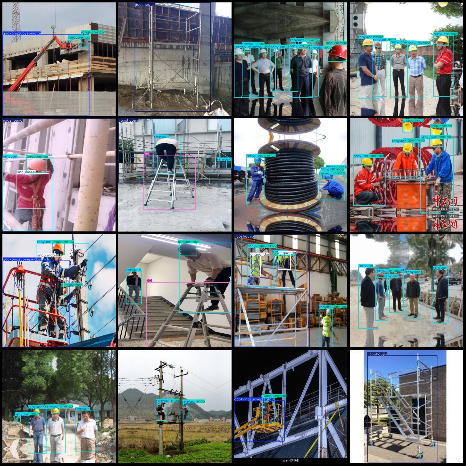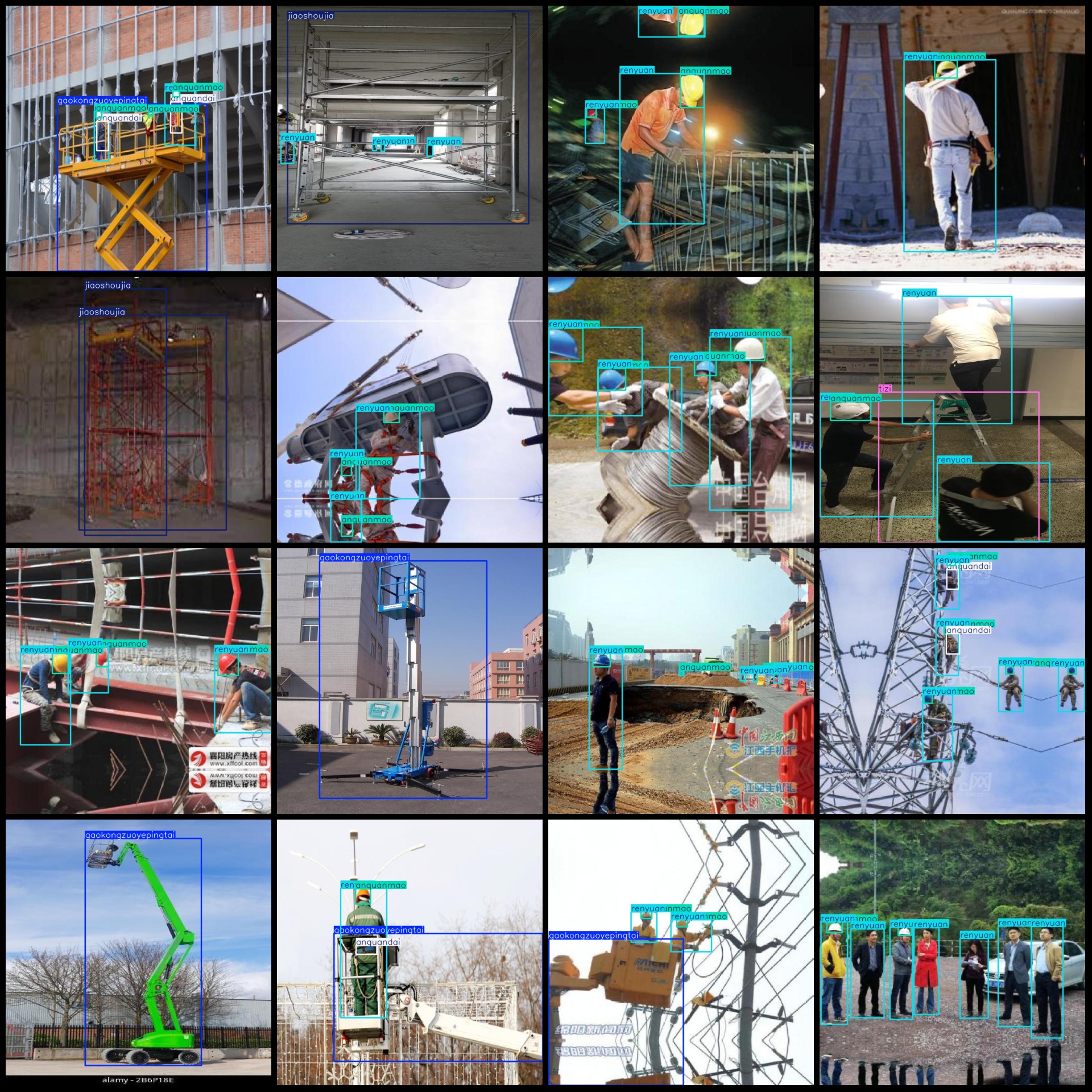 标注类别名称(注意yolo格式类别顺序不和这个对应,而以labels文件夹classes.txt为准):["anquandai","anquanmao","gaokongzuoyepingtai","jiaoshoujia","renyuan","tizi"]