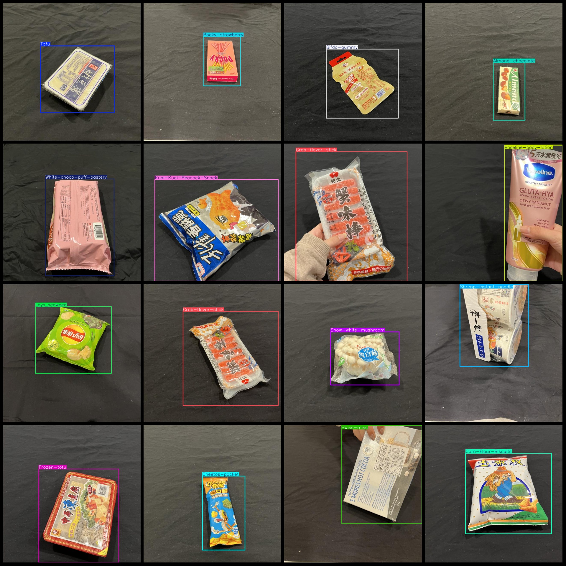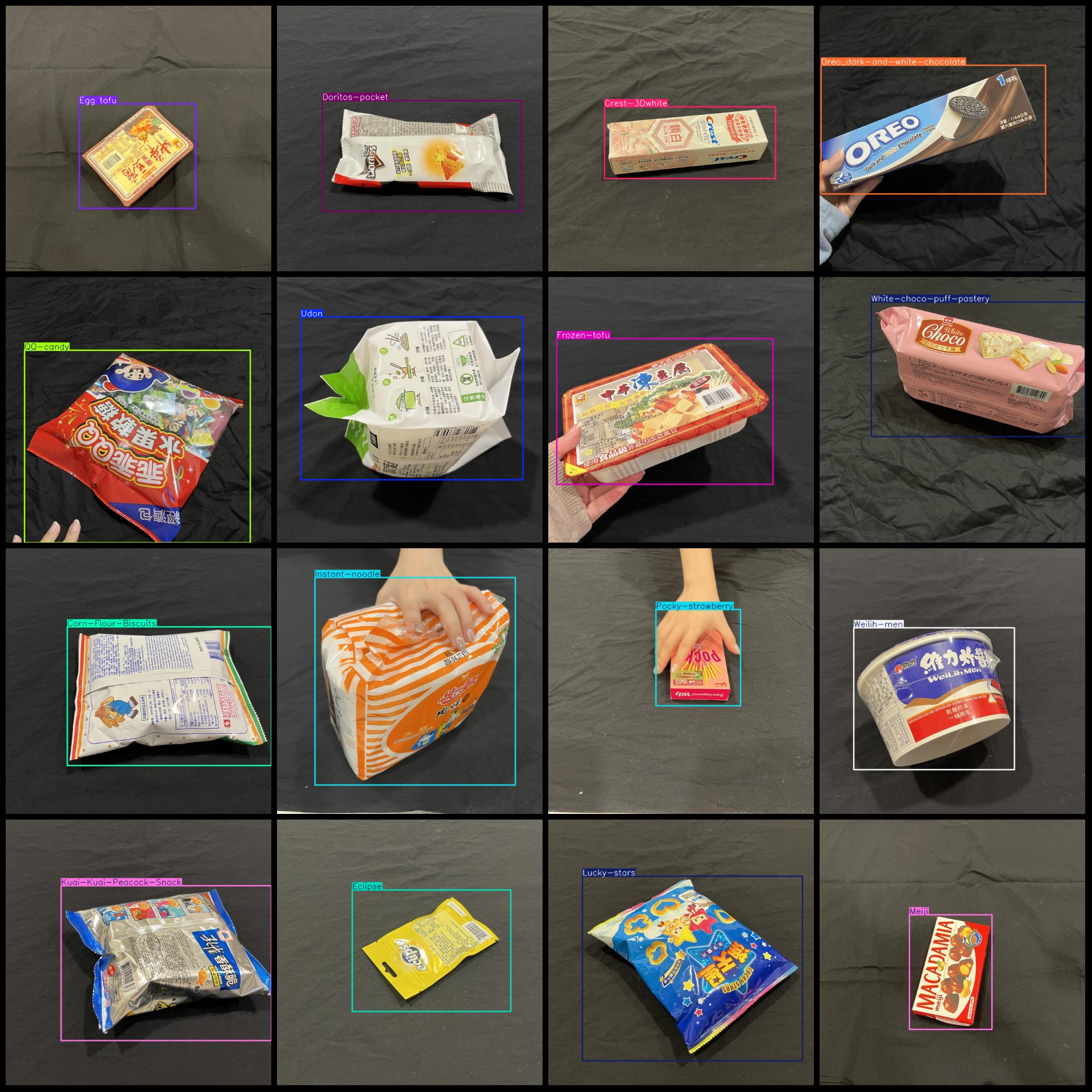 标注类别名称(注意yolo格式类别顺序不和这个对应,而以labels文件夹classes.txt为准):["Almond-chocolate","Ansung ramyun","Bifdo-gummy","Canned-food","Chafing-dishlamb-chisp","Cheerful-crackers","Cheetos","Cheetos-pocket","Colgate","Corn-Flour-Biscuits","Crab-flavor-stick","Crest-3Dwhite","Crispy-rolls_chocolate","Crispy-rolls_milk","Darlie","Doritos","Doritos-pocket","Eclipse","Egg tofu","Egg-roll","Eggs","Frozen-tofu","Fruit-jelly","Gummy-chocolate","Hibiscus-tofu","Imei_milk chocolate","Instant-noodle","Kuai-Kuai-Corn-Snack","Kuai-Kuai-Peacock-Snack","Lays_cheese","Lays_original","Lays_seaweed","Lucky-stars","May flower","Meiji","Milk","Milk-candy","Milk-puff","Oreo_dark-and-white-chocolate","Pad","Pea crackers","Pocari-sweat","Pocky original","Pocky-strawberry","QQ-candy","Rice-blood-cake","Shin-ramyun","Shrimp strips","Shrimp-instant-noodle","Sister-win","Snow-white-mushroom","Soup-base","Strawberry-puff","Swiss-miss","Taiyen-water","Tofu","Toothbrush","Udon","Vaseline-body-lotion","Weilih-men","White-choco-puff-pastery"]