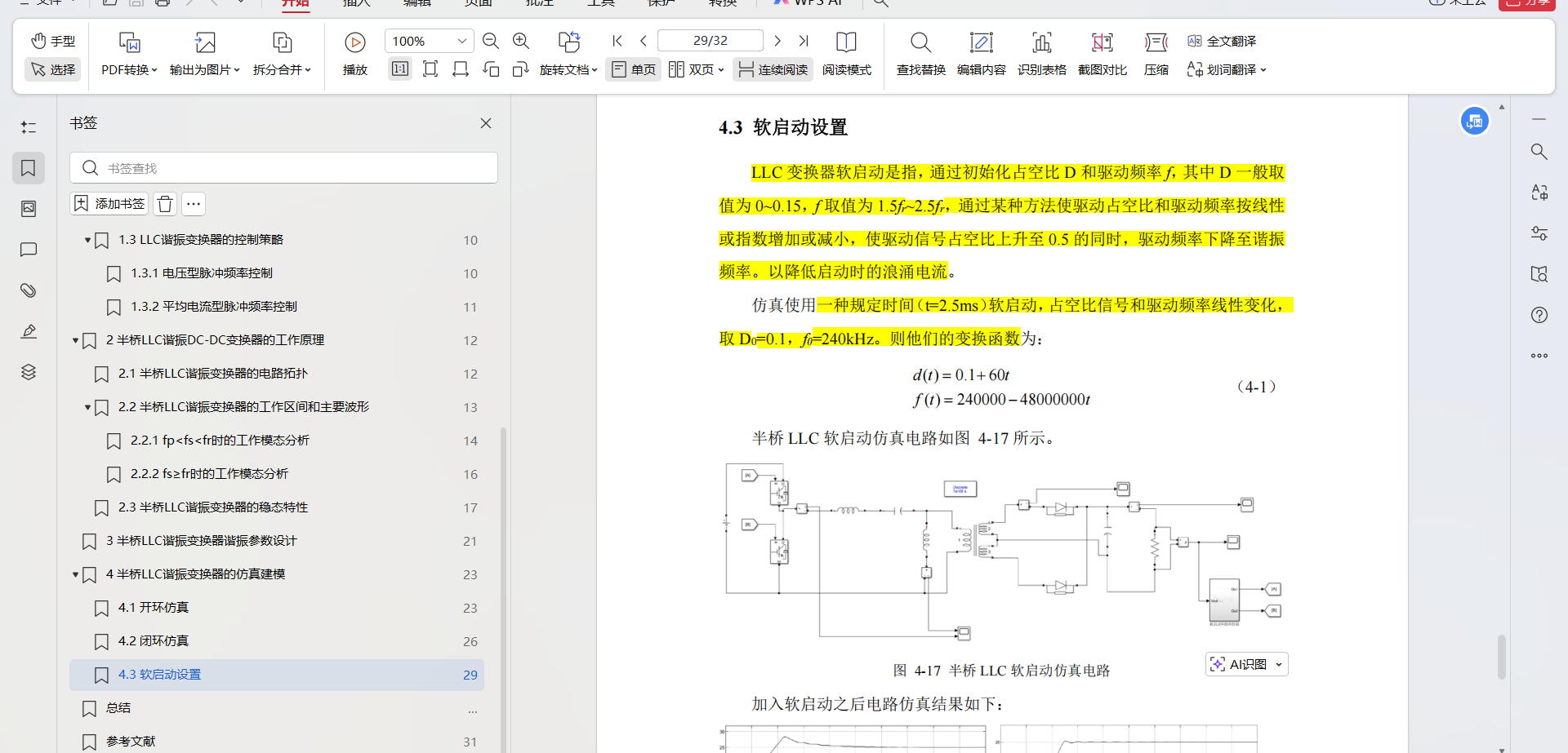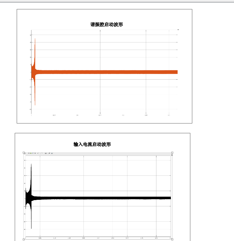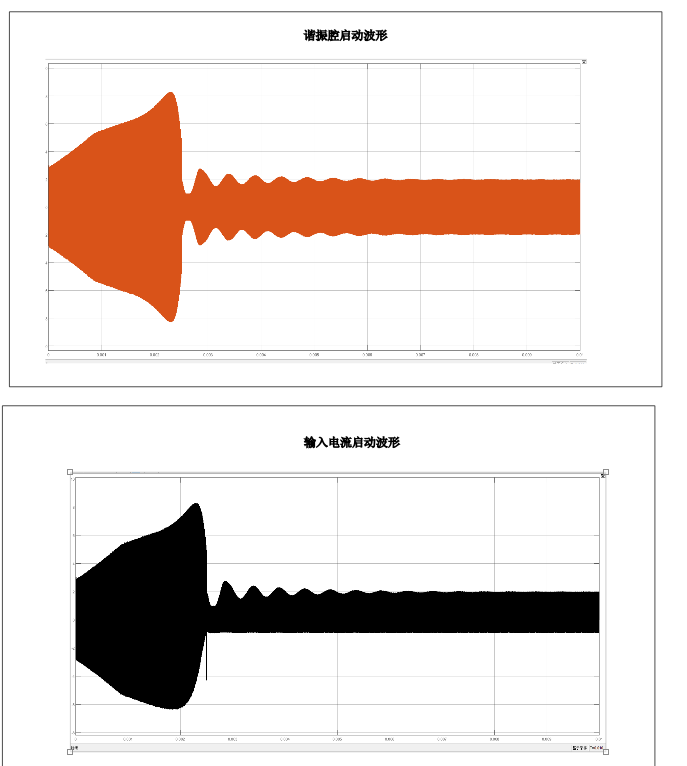 观察启动时谐振电感和励磁电感电流波形和输入电流波形,在启动时 他们均出现了很大的过电流,在现实运用中,这对器件的电流硬力提出了很高的 要求,因此需要设置一个软启动以减低启动时的浪涌电流。