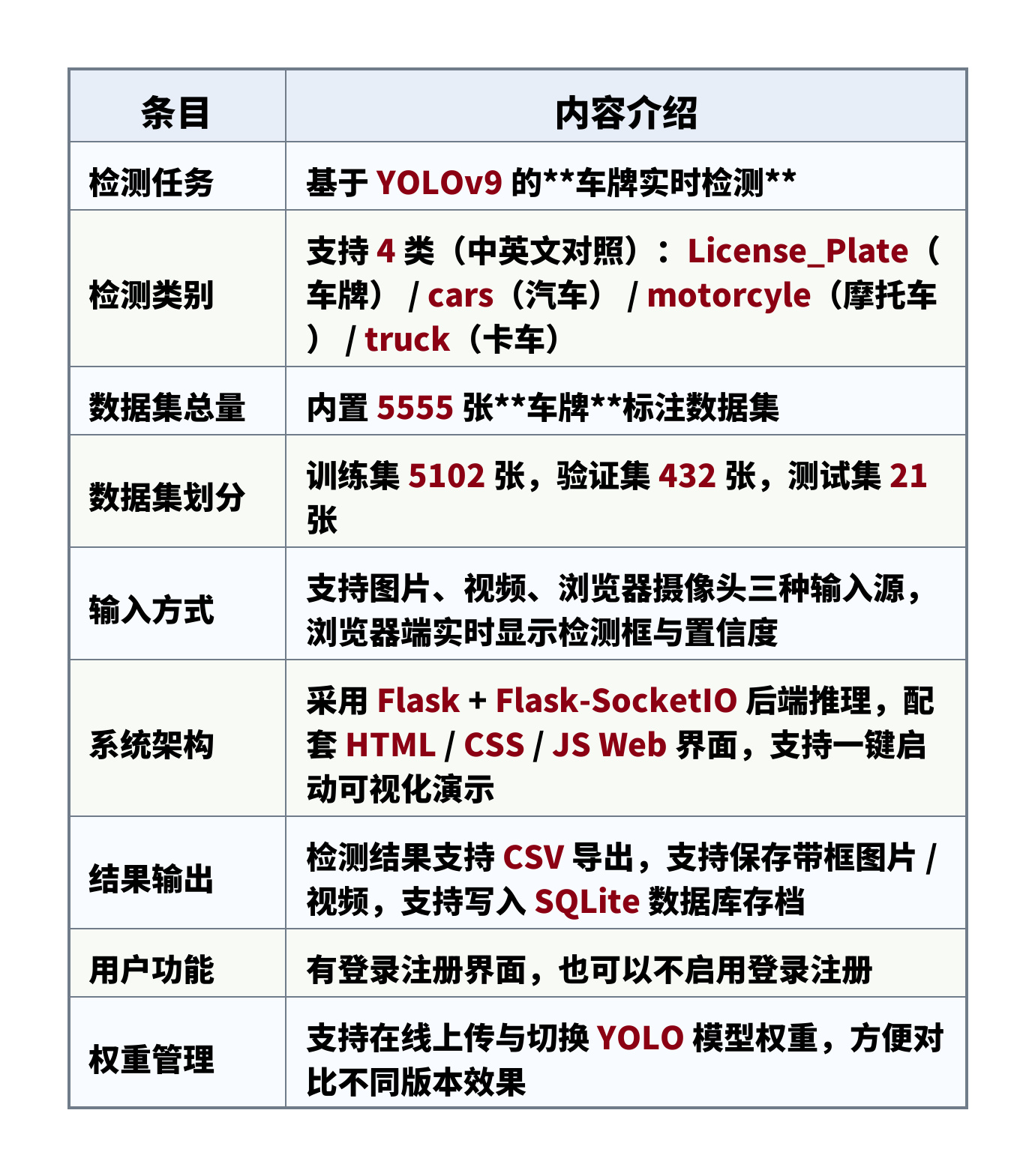 检测类别:支持 4 类(中英文对照):License_Plate(车牌) / cars(汽车) / motorcyle(摩托车) / truck(卡车)