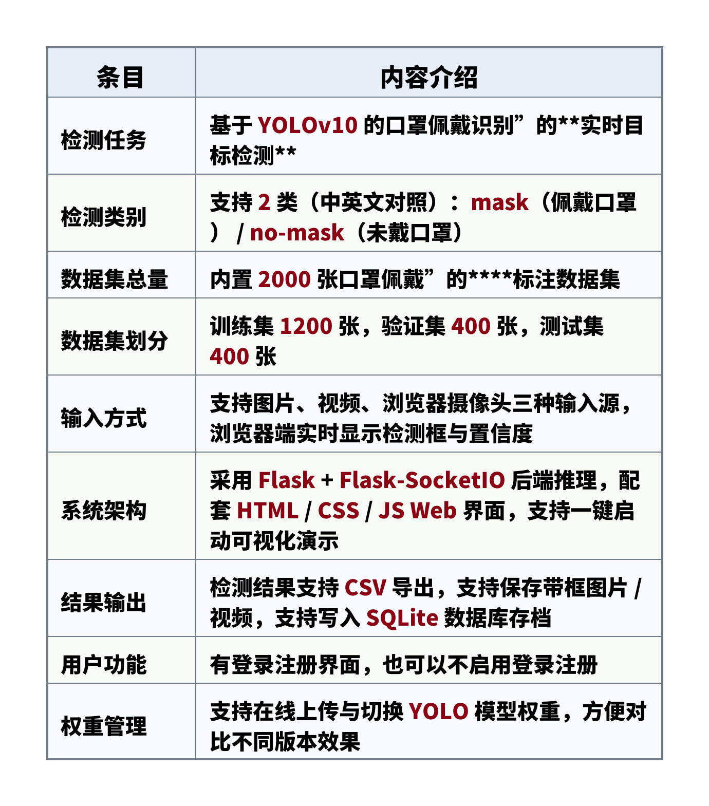 检测类别:支持 2 类(中英文对照):mask(佩戴口罩) / no-mask(未戴口罩)