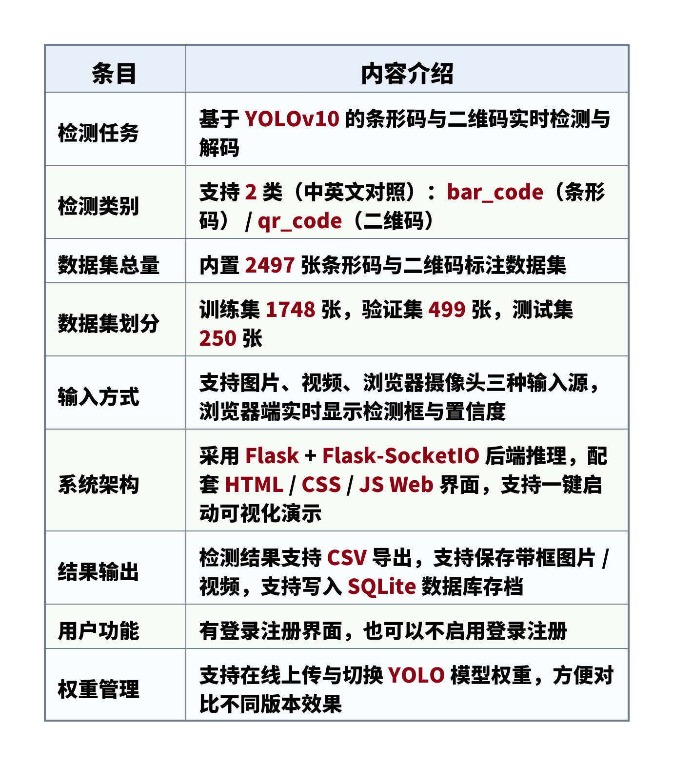 检测类别:支持 2 类(中英文对照):bar_code(条形码) / qr_code(二维码)