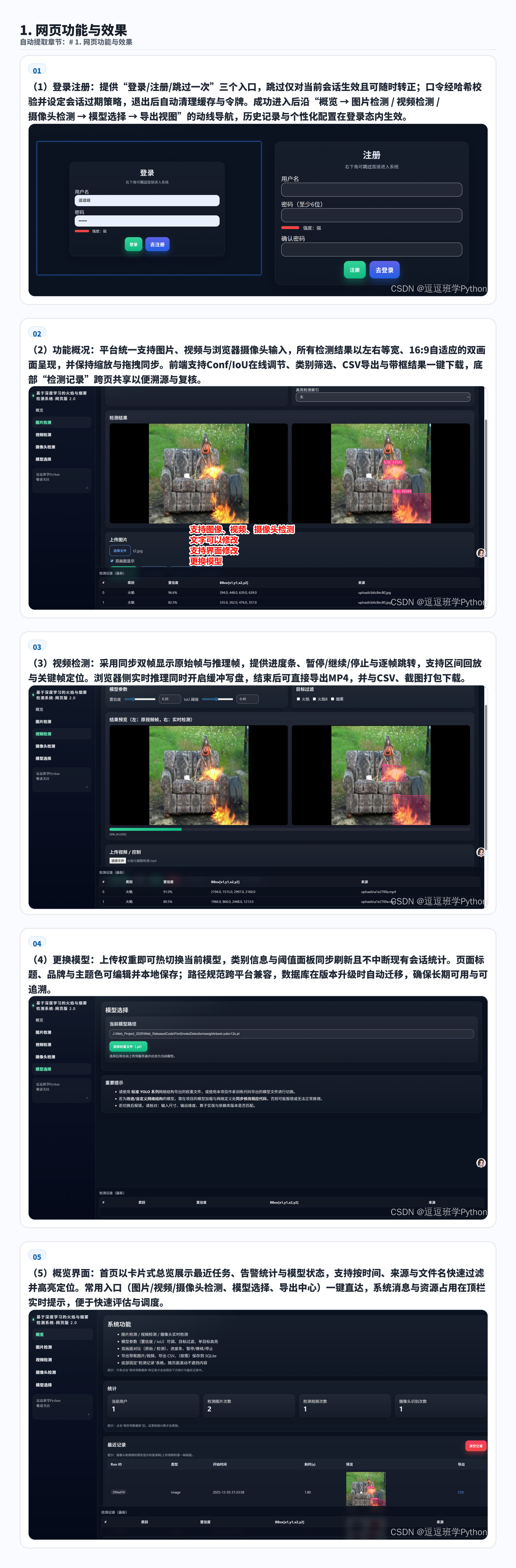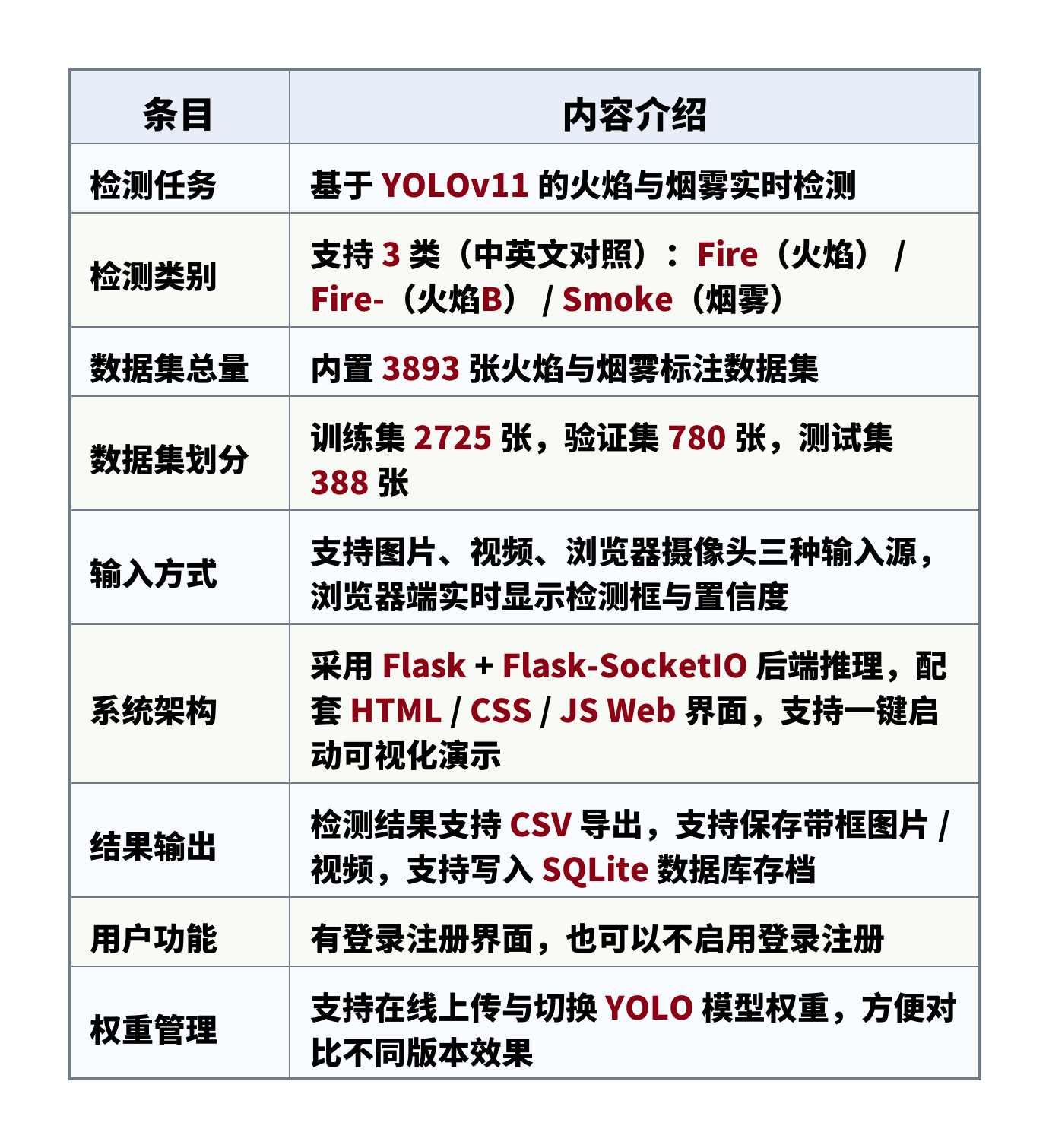 检测类别:支持 3 类(中英文对照):Fire(火焰) / Fire-(火焰B) / Smoke(烟雾)