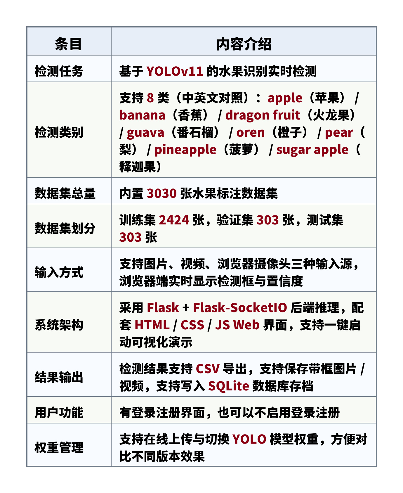 检测类别:支持 8 类(中英文对照):apple(苹果) / banana(香蕉) / dragon fruit(火龙果) / guava(番石榴) / oren(橙子) / pear(梨) / pineapple(菠萝) / sugar apple(释迦果)