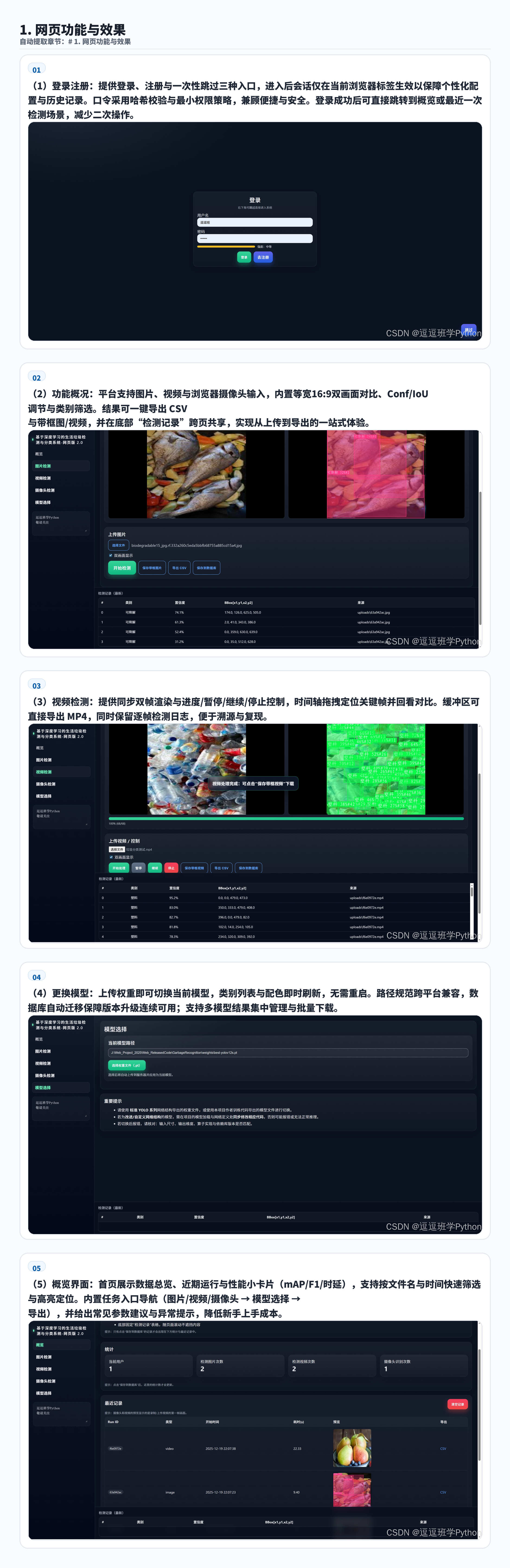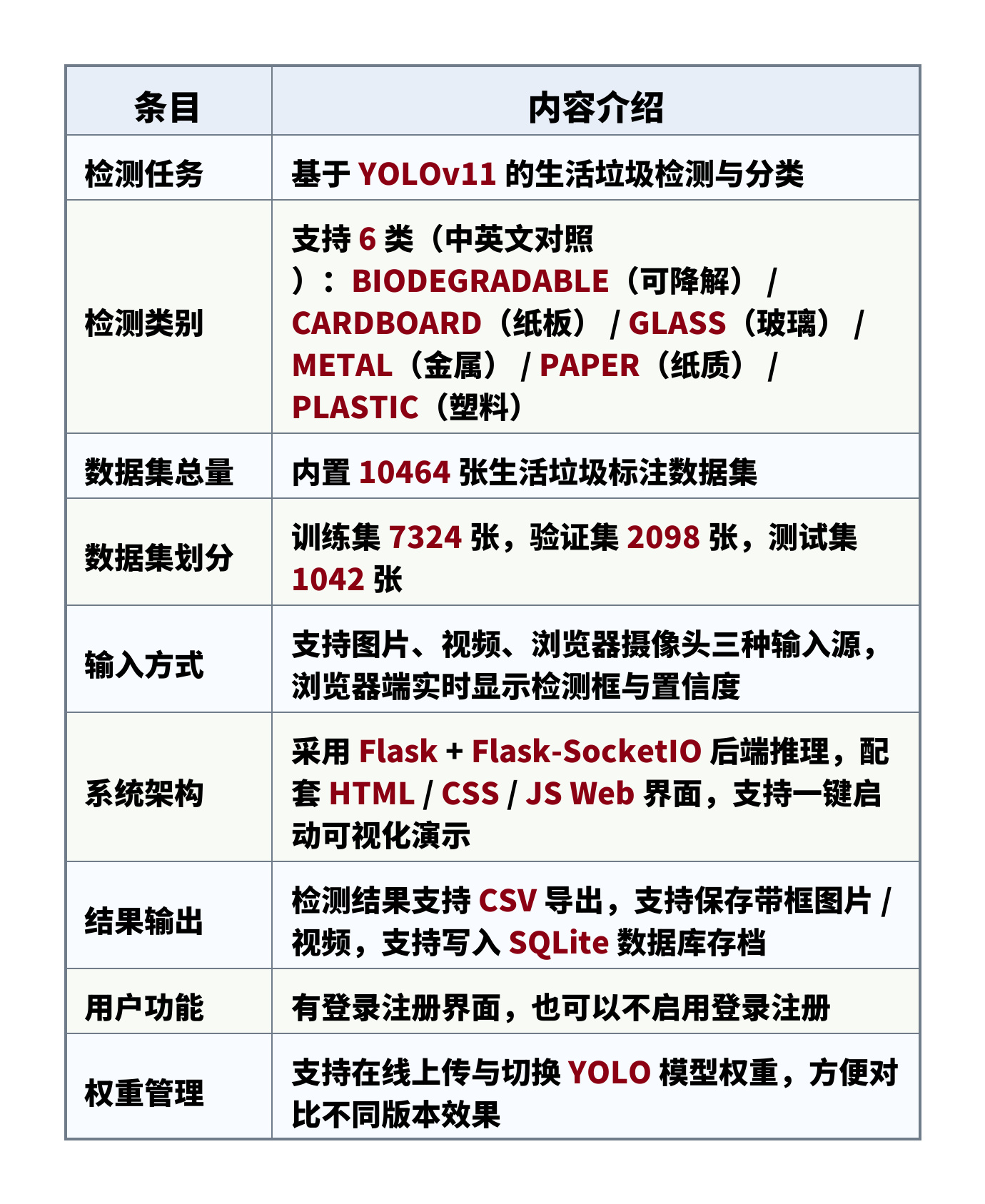 检测类别:支持 6 类(中英文对照):BIODEGRADABLE(可降解) / CARDBOARD(纸板) / GLASS(玻璃) / METAL(金属) / PAPER(纸质) / PLASTIC(塑料)