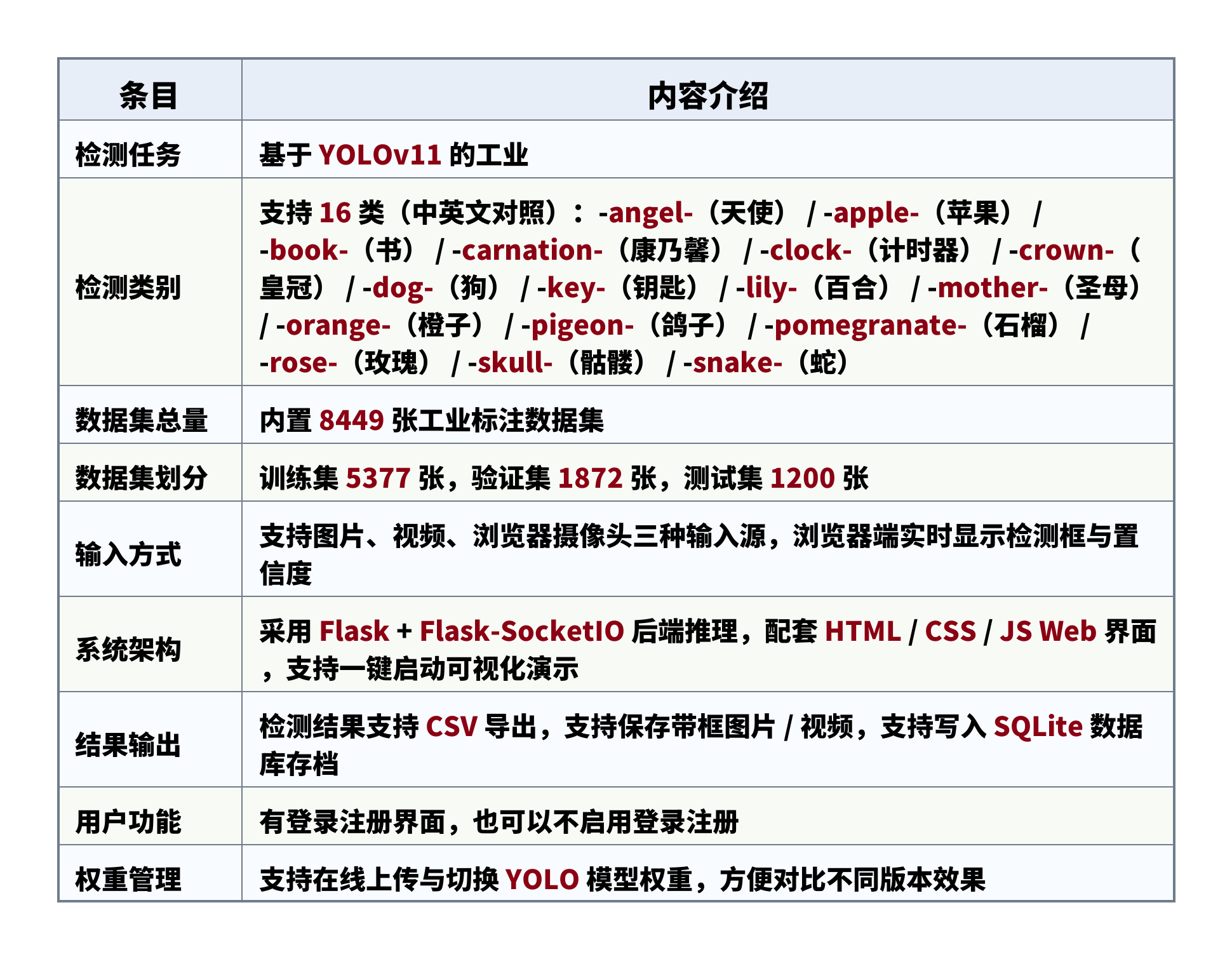 检测类别:支持 16 类(中英文对照):-angel-(天使) / -apple-(苹果) / -book-(书) / -carnation-(康乃馨) / -clock-(计时器) / -crown-(皇冠) / -dog-(狗) / -key-(钥匙) / -lily-(百合) / -mother-(圣母) / -orange-(橙子) / -pigeon-(鸽子) / -pomegranate-(石榴) / -rose-(玫瑰) / -skull-(骷髅) / -snake-(蛇)